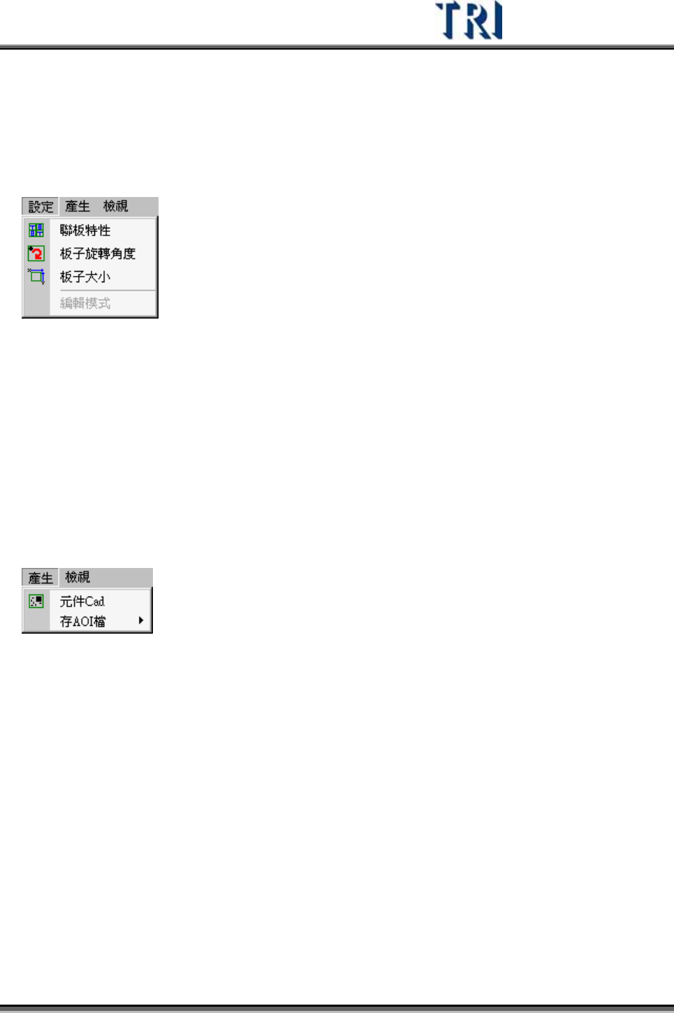 Test Research Inc. TRI 7500 Series User Gu ide – Software 255 4.3 產生多 連 板元件資 料 (Generate Multi-Board CAD Data) 4.3.1 設定 (S ET ) 此步驟中,在工具 列 之 [ 設定 ] 可以設定 [ 連 板特性 ] 、 [ 板子旋轉角 度 ] 及 [ 板子大小 ] 。 聯 板特性 (Board F…