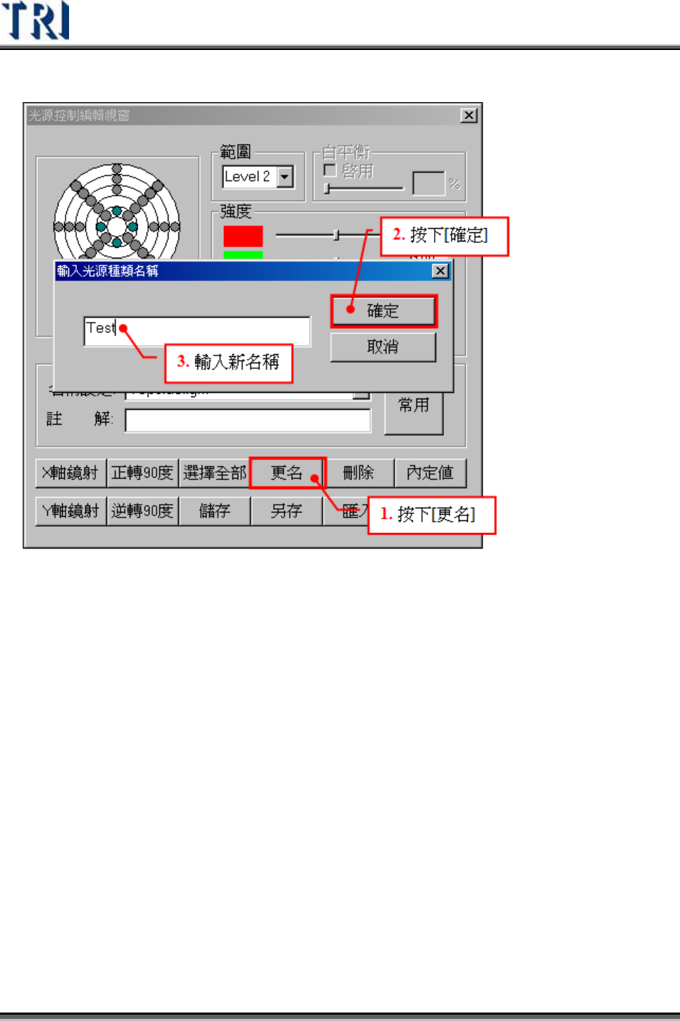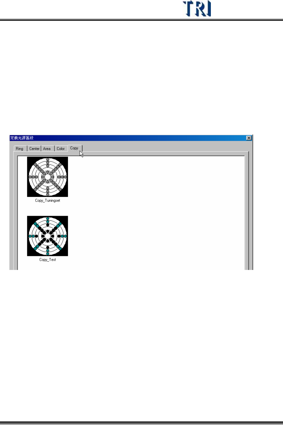 Test Research Inc. TRI 7500 Series User Gu ide – Software 273 14) 刪除 (Delete) – 刪除目前所選擇的燈光,確認後請按下 [ 是 ] 。 15) 內定值 (Type) – 按下後會以圖示顯示內定的一些燈光設定。只有在第 (5) 點 切 換至 [All] 時此按鈕才有效。 z 可自 行 新增一燈光且將燈光名稱設定為 “ 自訂名稱 1_ 自…
