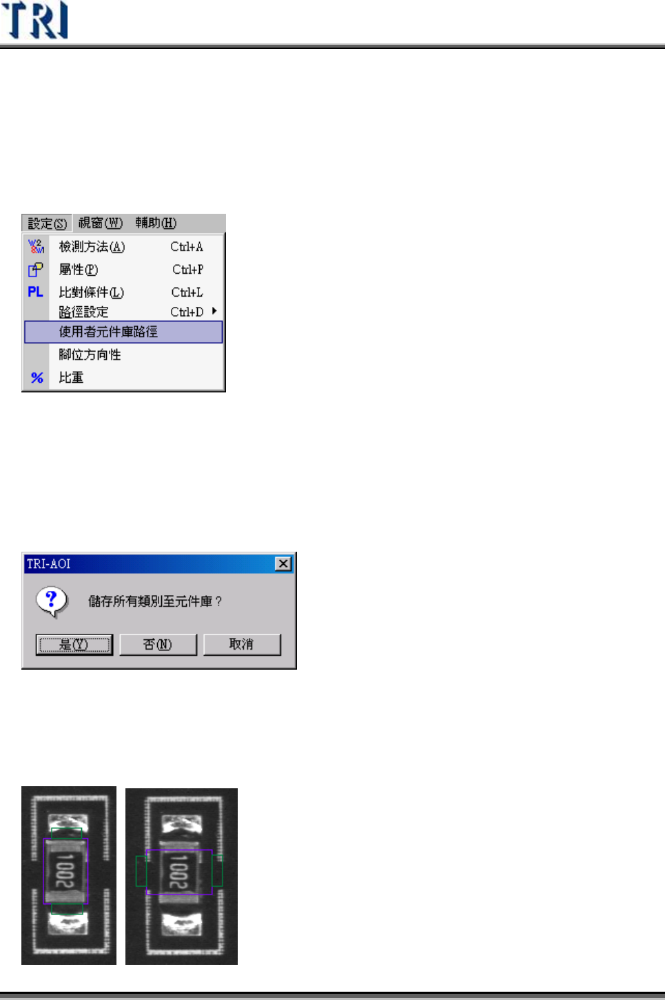 Test Research Inc. 284 TRI 7500 Series User Gu ide – Software 4.9.2.6 設成使用者元件庫 (Set to User Lib) 此功能只有在此 Library 為 [Project Library] 時才可以使用,選擇本按鈕時可將此 Library 設定為使用者資 料 庫 [User Library] ,將 pkg 檔由 [TRI_PRJ_LI…