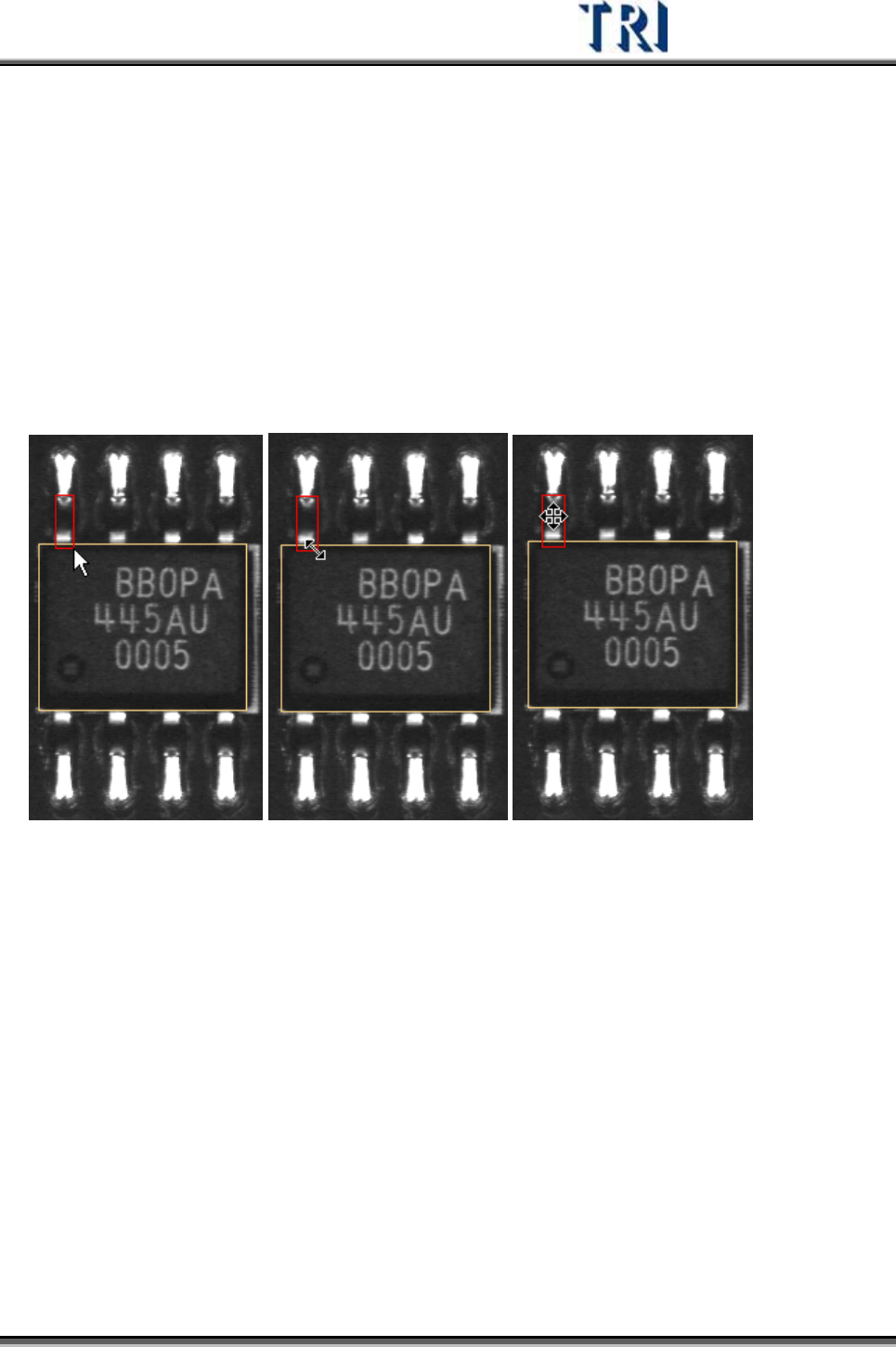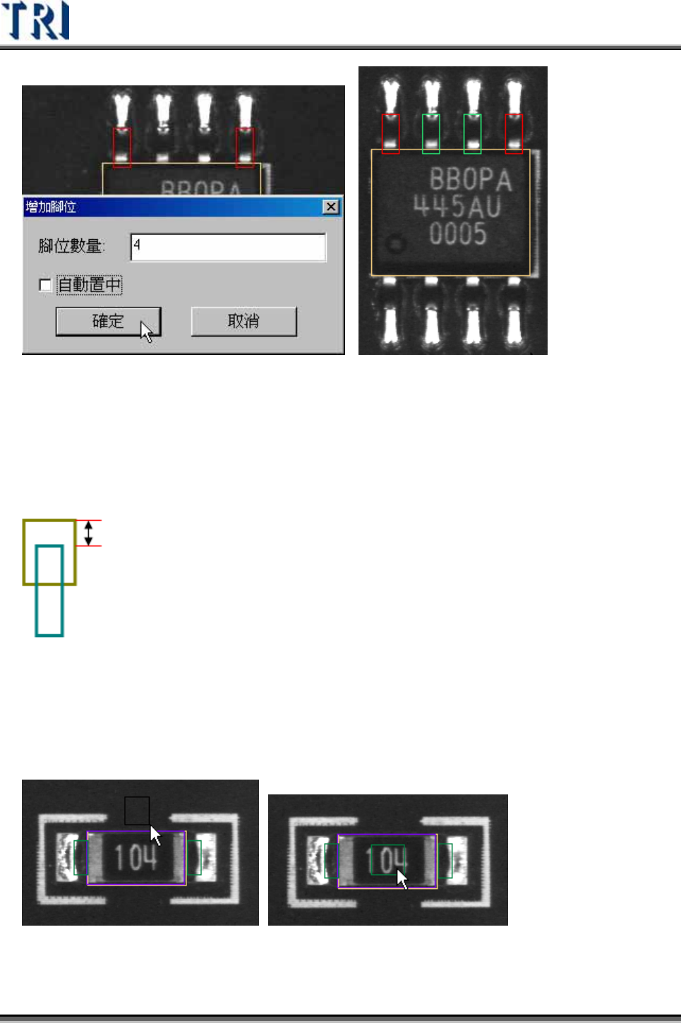 Test Research Inc. 292 TRI 7500 Series User Gu ide – Software 4.9.5.3 焊盤 (PAD) 增加 PAD 框。 PAD 框無檢測作用,但有建 立 PAD 框的元件,在載入資 料 庫時可以 利 用 PAD 長 度 作為搜尋資訊。 PAD 框的建 立 方式如下圖,而系統會自動算出 露 出 PAD 的長 度 。 4.9.5.4 檢測框 (Window) …
