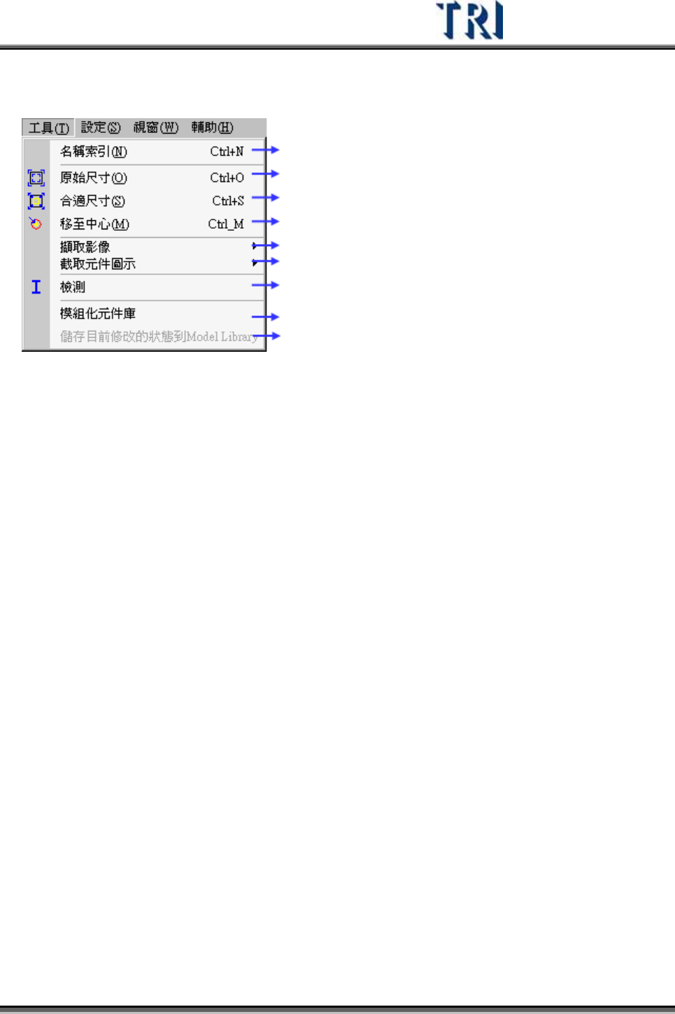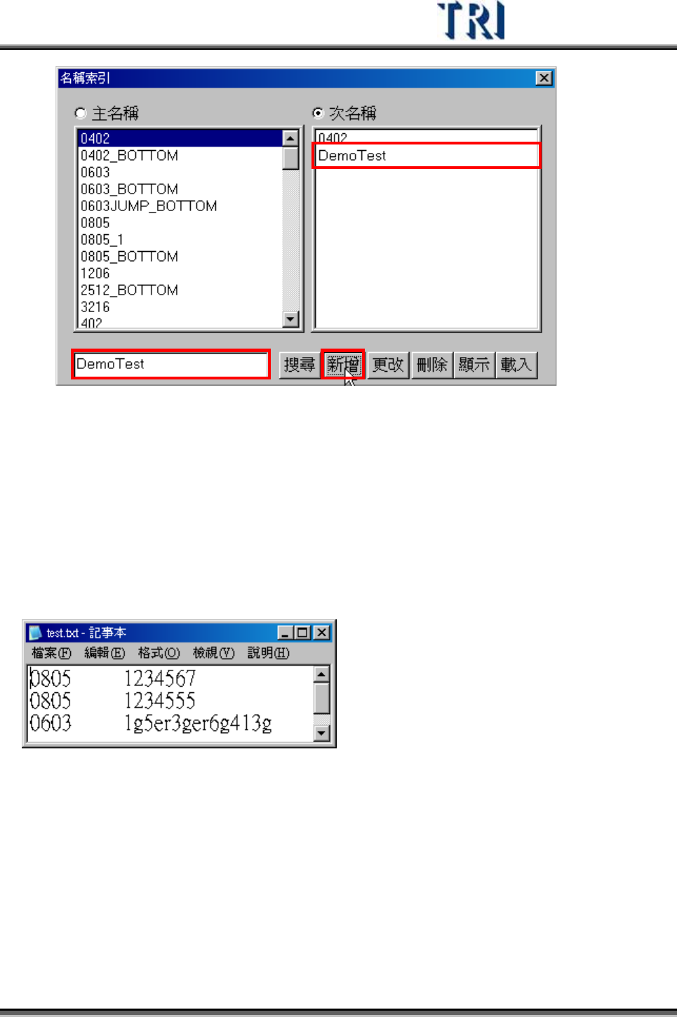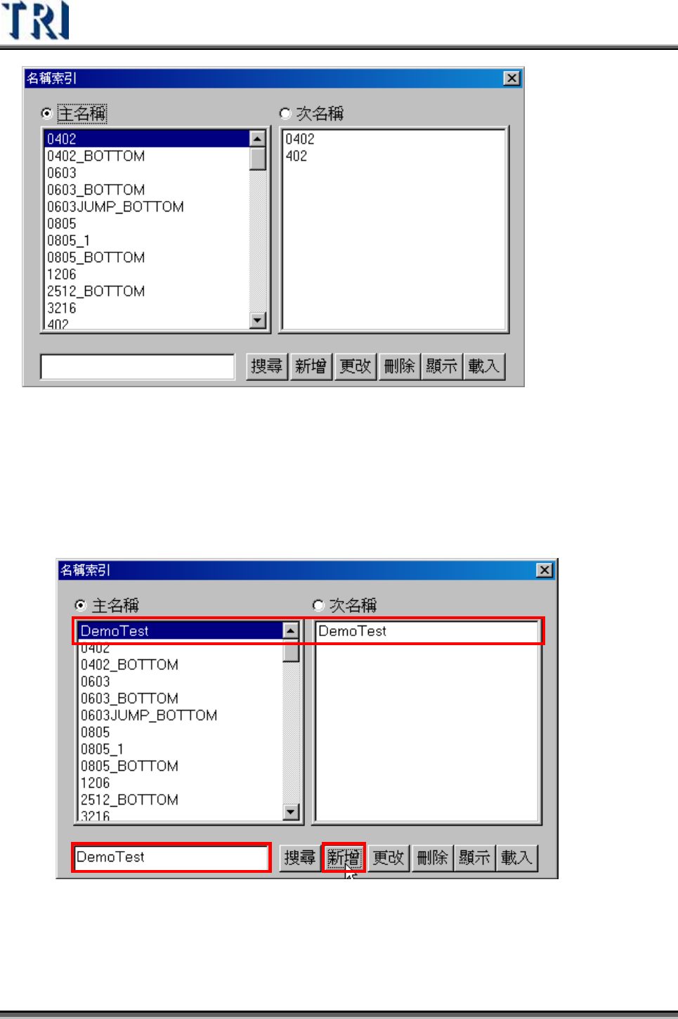 Test Research Inc. 298 TRI 7500 Series User Gu ide – Software 搜尋 – 根據左下角輸入 欄 位之內容尋找完全吻合的形式名稱,無 論 是在主名稱 欄 或 次名稱 欄 中有找到的就會被 列 出。 新增 – 新增一個名稱 索 引至所點選的 欄 位中 z 新增一 索 引至主名稱 z 新增一 索 引至次名稱
