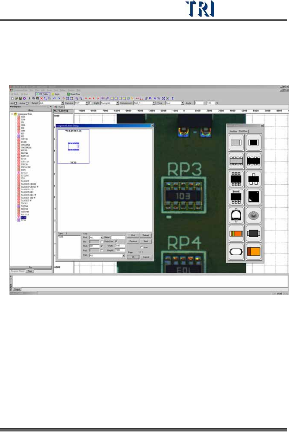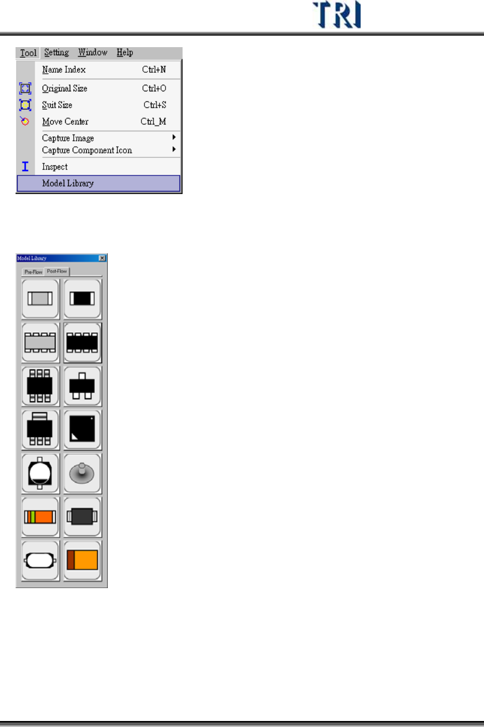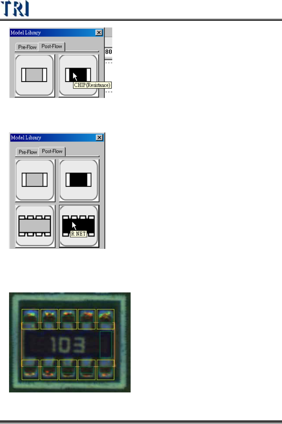 Test Research Inc. 308 TRI 7500 Series User Gu ide – Software Step5. 點選預套用的模組,本 例 為 R NET 。 Step6. 出現已建構完成的預設檢測框,如下圖所示。檢測框 類 型及 參數 為預設值, 位置及大小依 Body 及 Pin 框決定。
