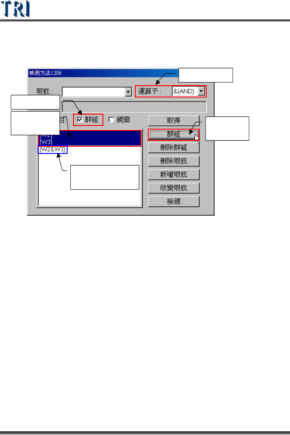 群組(Group) – 按下後系統會依目前所選擇的邏輯運算子設定到所選定的檢測框