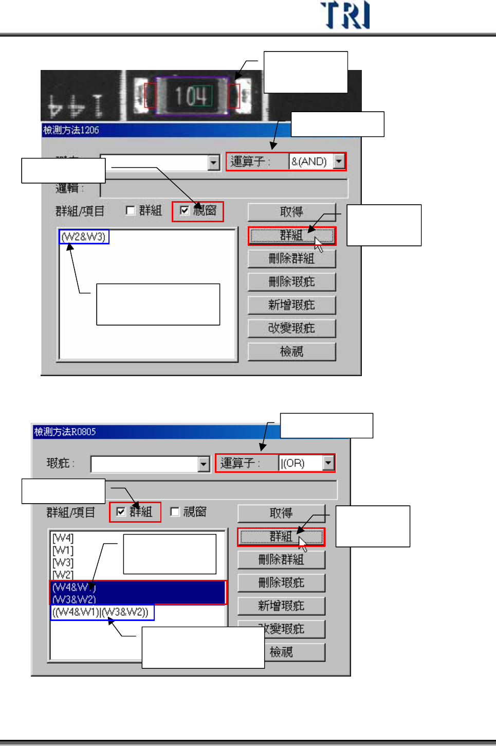 Test Research Inc. 322 TRI 7500 Series User Gu ide – Software z [ 群組 / 項目 ] 中勾選群組 – 表示從視窗 列 表中選定需要設定 邏 輯的檢測框名稱後, 按下 [ 群組 ] ,即可將選擇的檢測框用運算子結合起 來 , [ 群組 ] 的結果 列 在視窗 列 表 最下方。 1. 選擇運 算子 2. 選擇群 組 3. 選擇檢 測 框名稱 4. 按下…