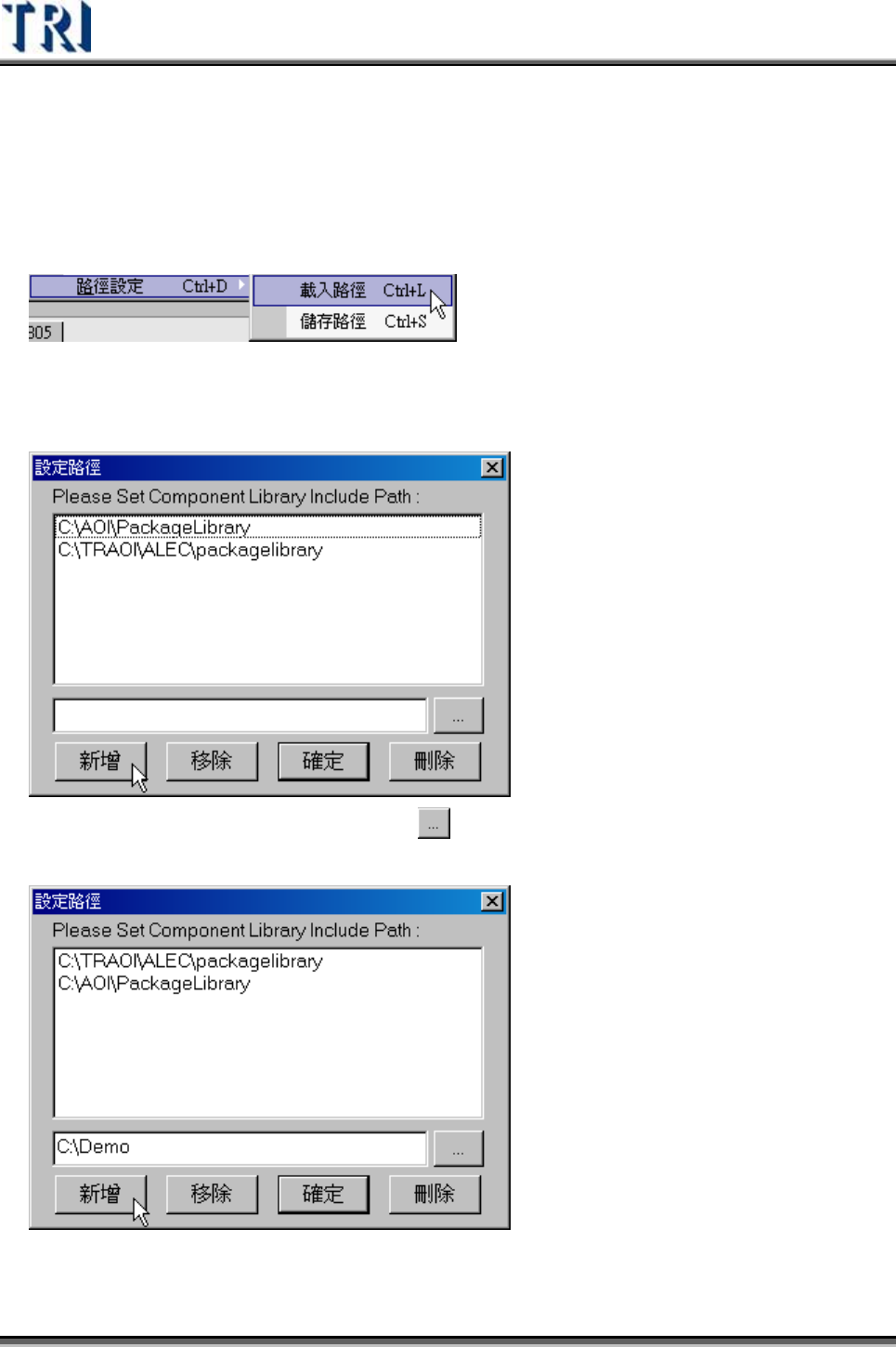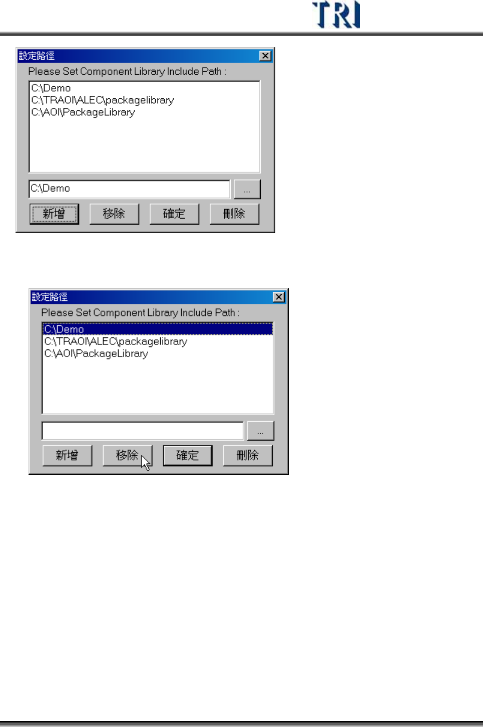 Test Research Inc. TRI 7500 Series User Gu ide – Software 339 z 移除 – 在 路 徑 列 表中選擇欲刪除的 路 徑後按下 [ 移除 ] ,則可移除此 路 徑。 z 確定 – 儲存對於 路 徑的改變並關閉 [ 設定 路 徑 ] 視窗。 z 取消 – 不 儲存對於 路 徑的任何改變且關閉 [ 設定 路 徑 ] 視窗。 儲存 路 徑 – 資 料 庫…