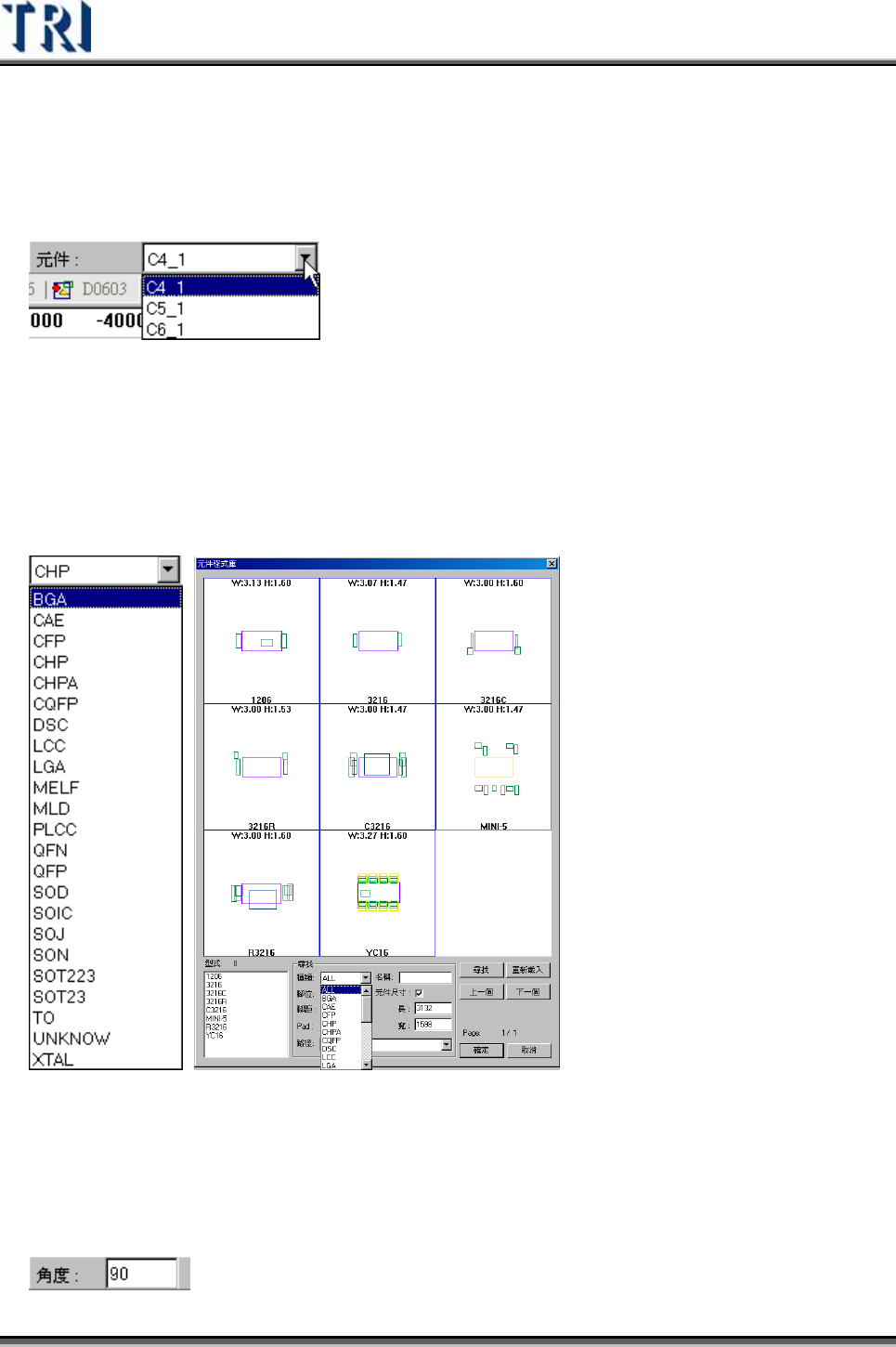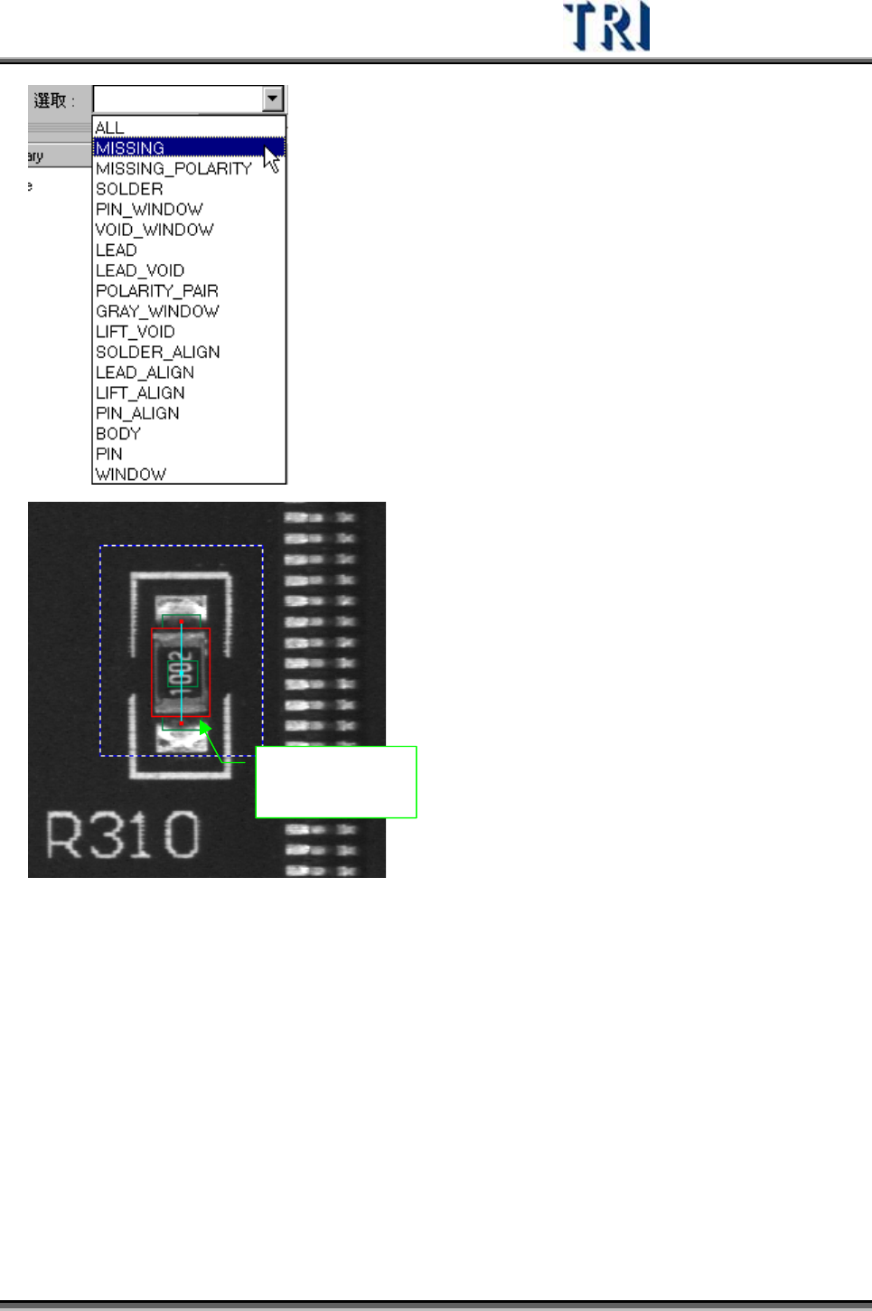Test Research Inc. 344 TRI 7500 Series User Gu ide – Software 4.9.9.6 元件 (Component) 這 裡 會 列 出所有屬於欲建 立 資 料 庫形式的元件,攝影機將會移動到點選的元件上方取 像,在建 立 資 料 庫時可使用此功能,先選擇一個看 來 最漂 亮 且沒有旋轉或偏移的元件 來 建 立 資 料 庫。 4.9.9.7 類 別 (Type)…