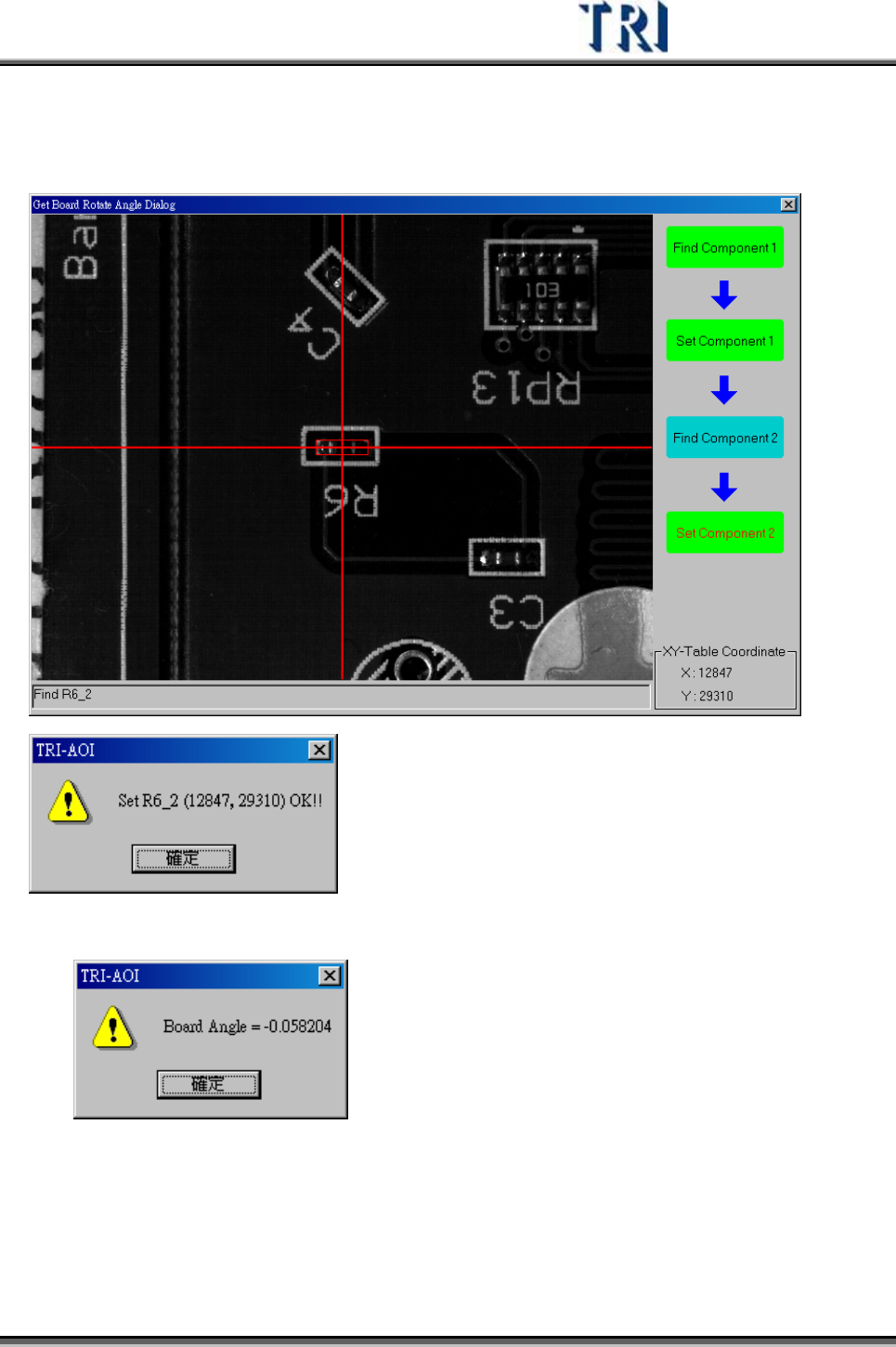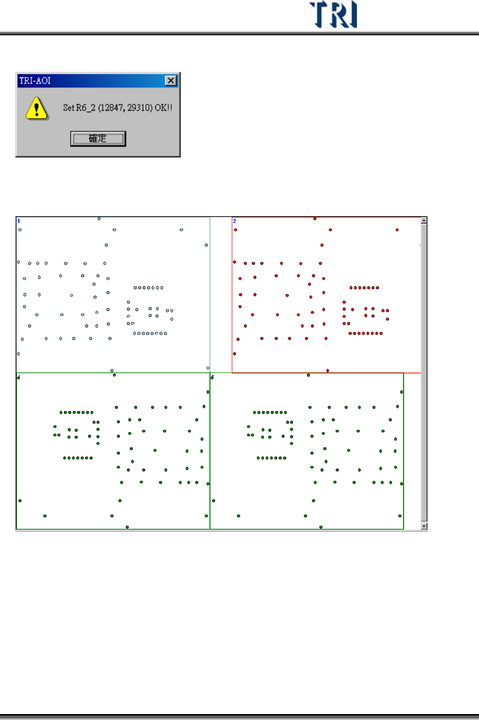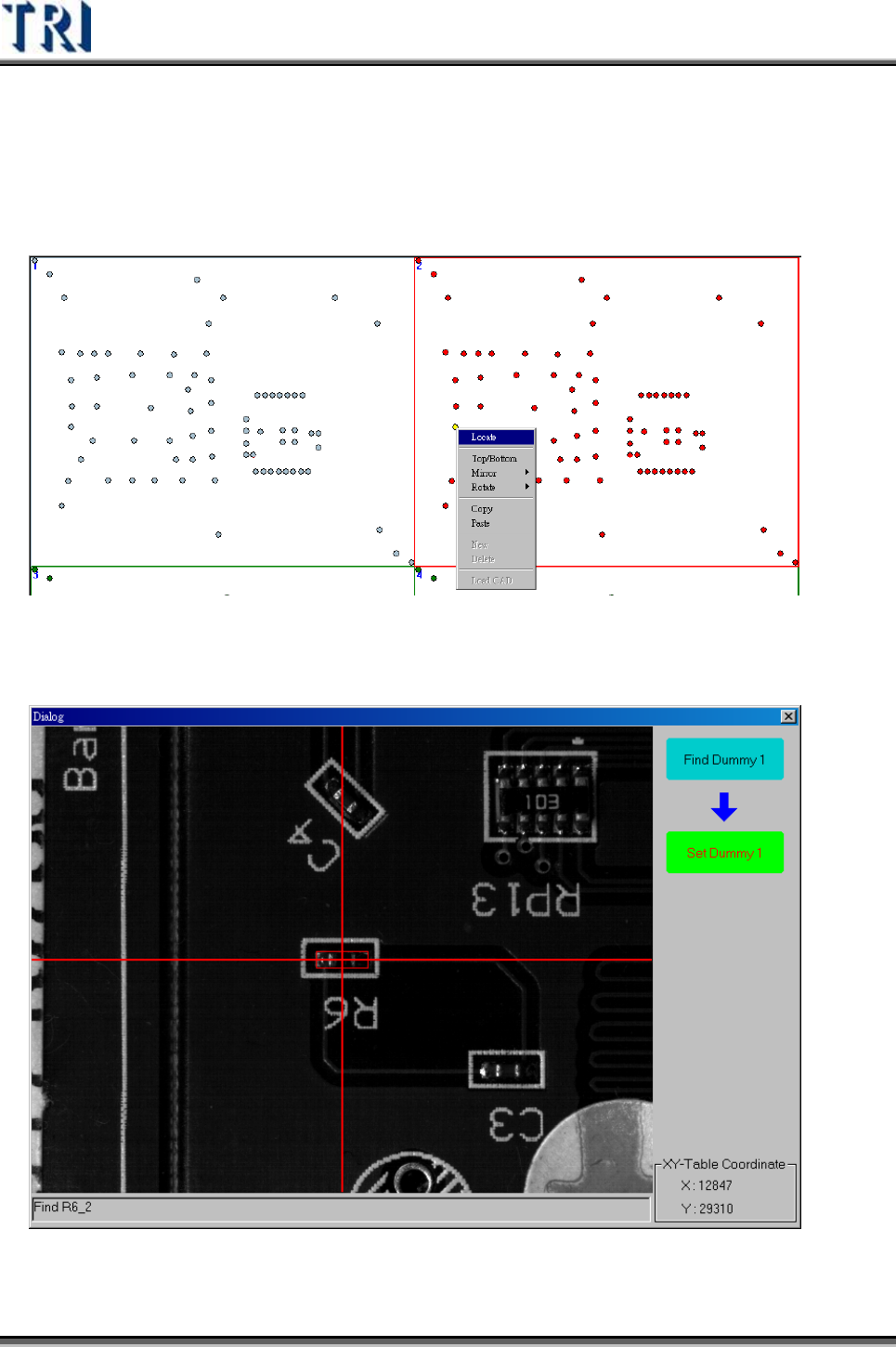 Test Research Inc. 24 TRI 7500 Series User Gu ide – Software 先定左上 0 度 top 的板子,再定右下 0 度 top 的板子,如此所有 0 度 top 板會全被 定位。再去定位其它角 度 或反面的板子。被定位過的板子會以灰色顯示。 1) 對於 2 號板中,代表欲定位的元件的圖示按右鍵,並選擇 [ 定位 (Locate)] 。 2) 移動攝影機中心…