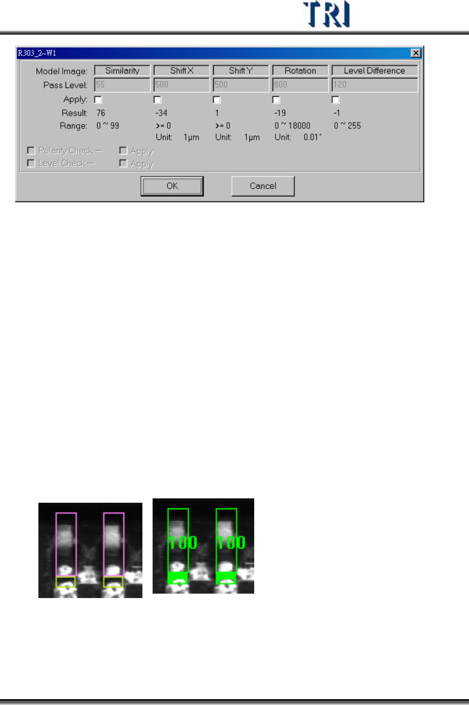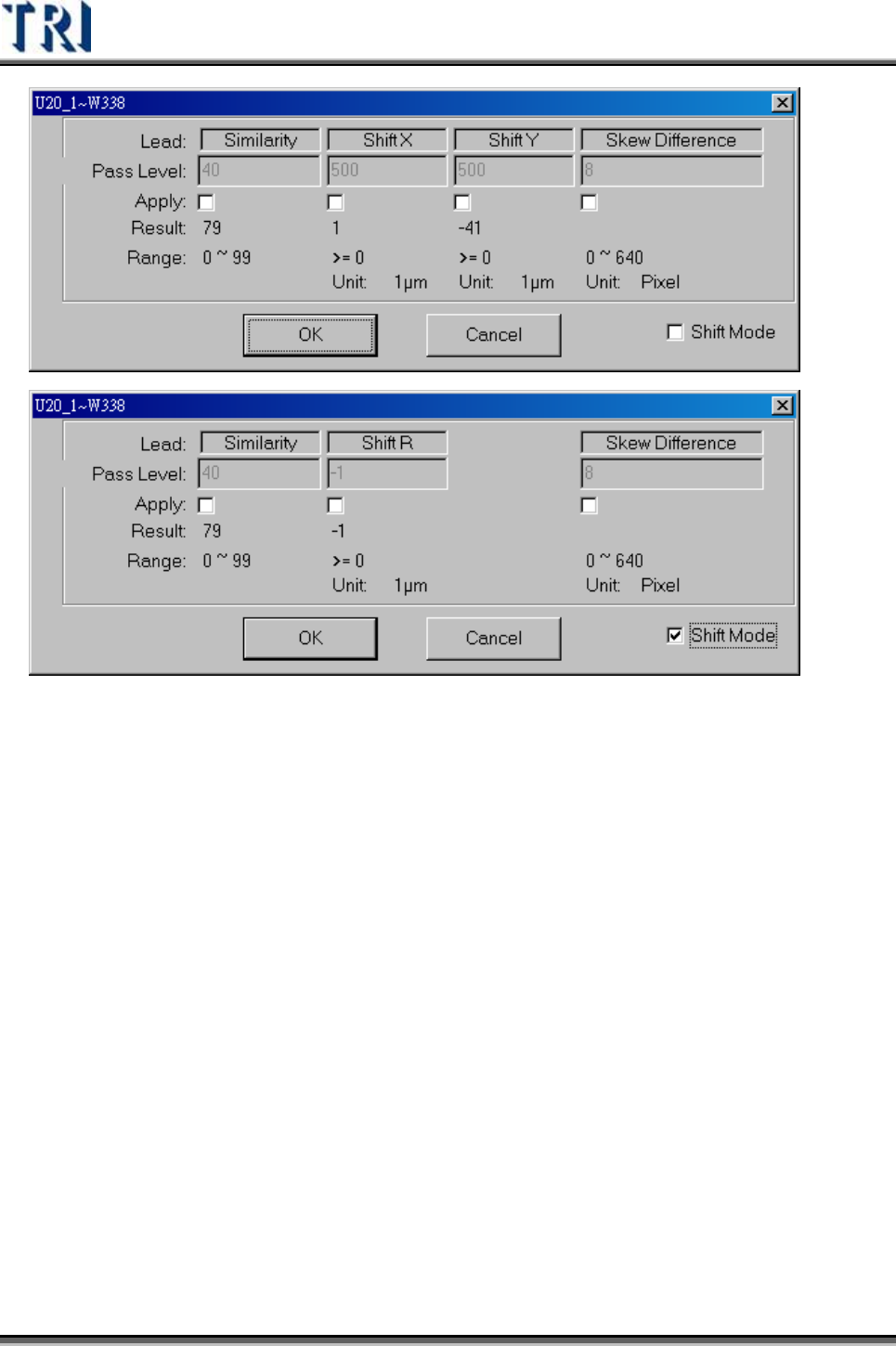 Test Research Inc. 356 TRI 7500 Series User Gu ide – Software Similarity – 待測影像與標準影像之相似 度 標準 Shift X – 待測元件之 X 方向位移的容許程 度 Shift Y – 待測元件之 Y 方向位移的容許程 度 Skew Difference – 相鄰 兩 個 [Lead] 框之間的高低差的容許程 度 S…