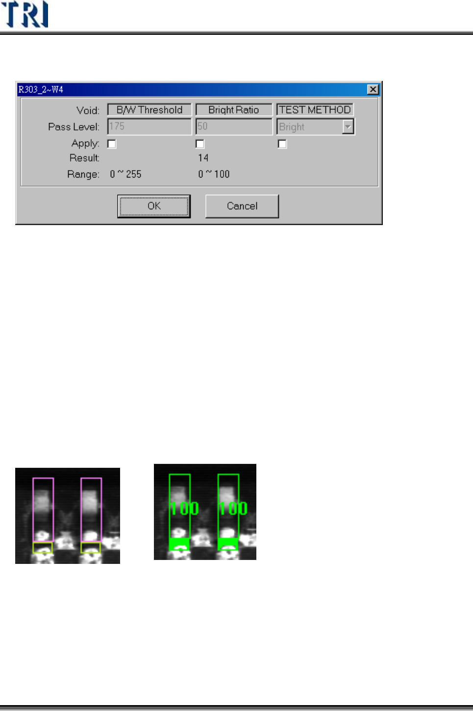 Test Research Inc. 358 TRI 7500 Series User Gu ide – Software 檢測 參數 設定畫面 B/W Threshold – 判定黑與白分野的門檻值。 Bright Ratio – 則表示檢測框中白色所佔的比 例 。 TEST Method z Bright – 若 檢測框中白色區域超出設定的比 例 則判定為瑕疵。 z Dark – 若 檢測框中白色…