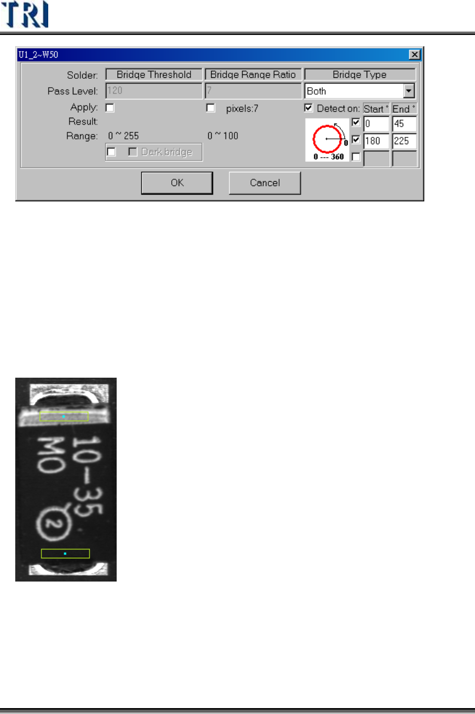 Test Research Inc. 362 TRI 7500 Series User Gu ide – Software Dark bridge – 若 短 路 的影像為黑色時,勾選 [Dark bridge] 表示抓黑色,即檢測從檢 測框邊緣開始有 連 續多個 pixel 的灰階值皆低於其門檻值 (Bridge Threshold) 即視為 短 路 。。 4.10.2.7 Polarity Pair 是 …