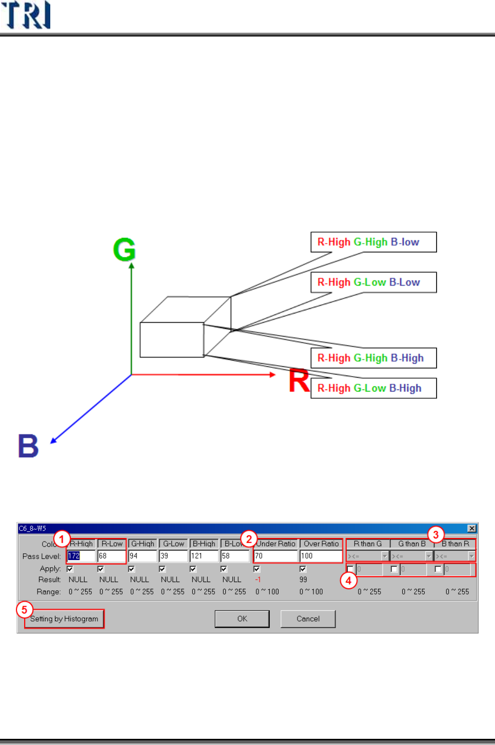 用來檢測 RGB在特定範圍或條件下所佔的比重,可用來檢測灰階差異不明顯但某一