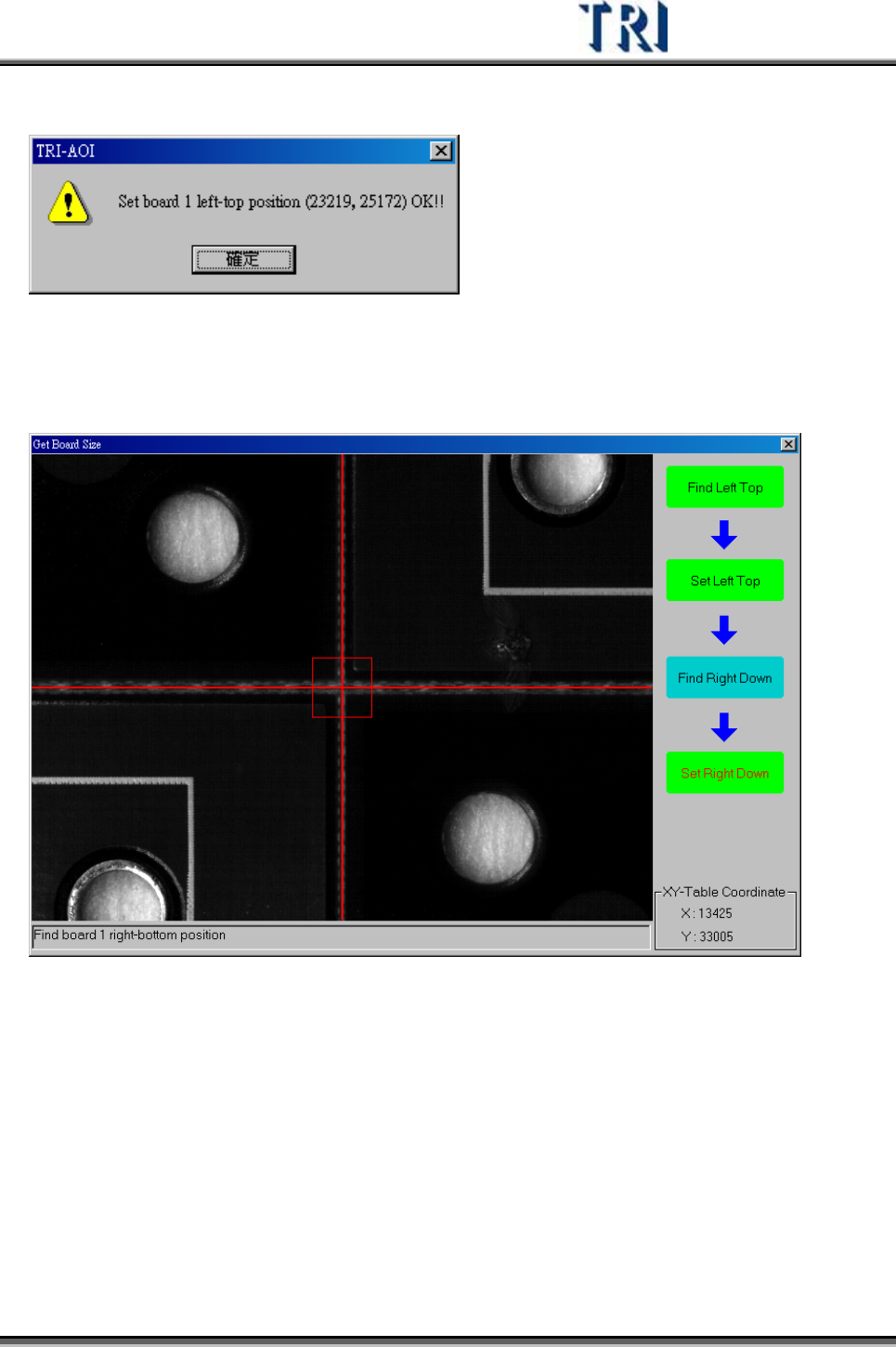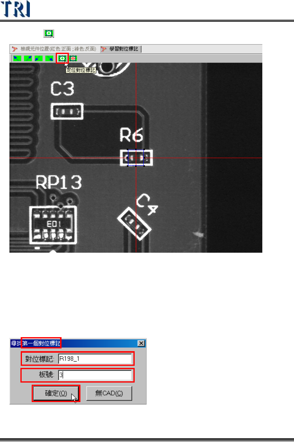 Test Research Inc. TRI 7500 Series User Gu ide – Software 29 2) 出現確認 1 號電 路 板左上角位置座標視窗,請按 [ 確定 ] 。 3) 將攝影機移動到 1 號電 路 板的右下角位置後,按下 [Set Right Down] 按鈕,取得 其座標位置。 4) 按下 [ 下一步 ] 按鈕。 2.5 學習對位標記 2.5.1 學習對位標記 學習對位標…