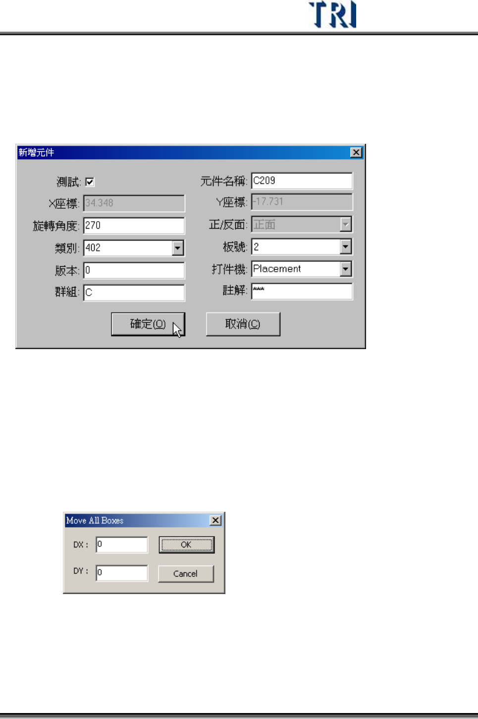 話窗,輸入此顆元件資訊後,按下[確定]即可。在新增元件的附近 2mm 的範圍