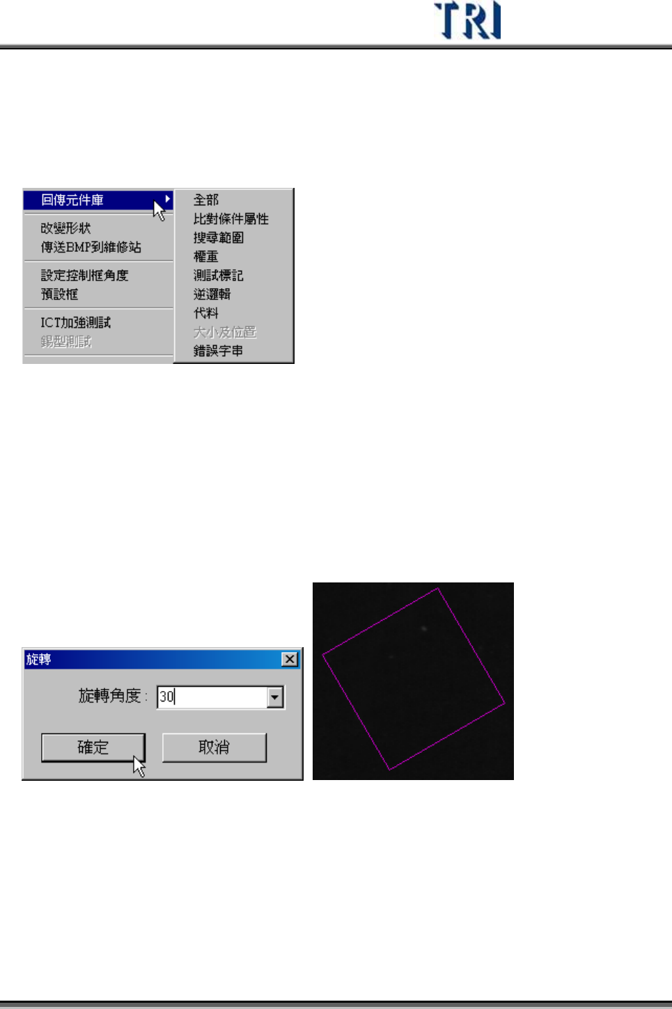 Test Research Inc. TRI 7500 Series User Gu ide – Software 403 23) 回傳元件庫 (Set to Library) – 可選擇將選擇的檢測框的 [ 比對條件屬性 ] 、 [ 搜尋範 圍 ] 、 [ 權重 ] 、 [ 測試標記 ] 、 [ 逆 邏 輯 ] 、 [ 代 料 ] 、 [ 大小及位置 ] 與 [ 錯誤字 串 ] 回傳至元 件資 料 庫 (L…