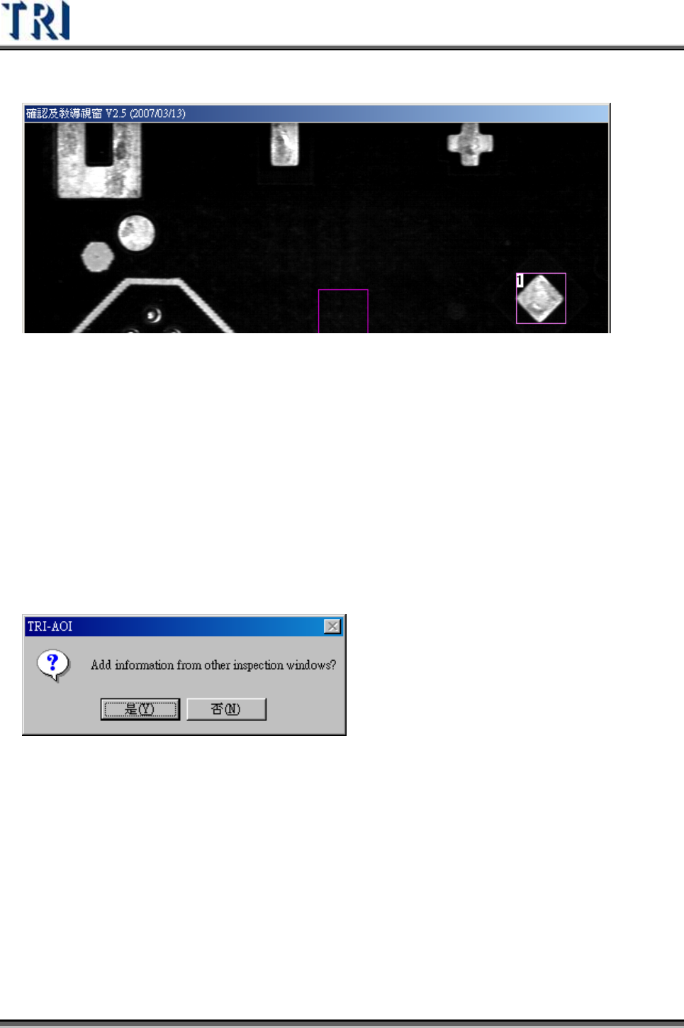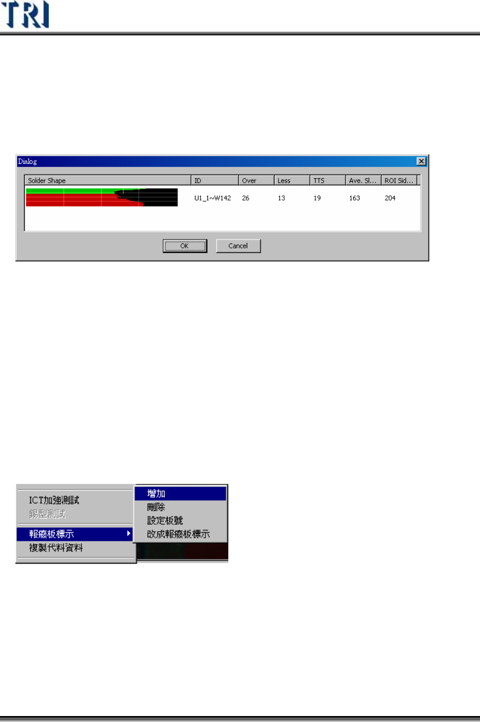 Test Research Inc. TRI 7500 Series User Gu ide – Software 405 Step2. 按 滑 鼠右鍵選擇增加報廢板標示點。 Step3. 選擇該點的檢測 邏 輯。 Step4. 選擇套用範圍。