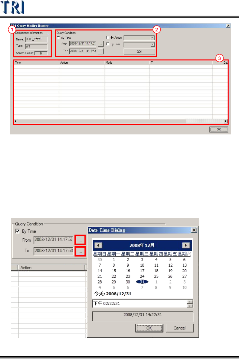 Test Research Inc. TRI 7500 Series User Gu ide – Software 409 z 動作 (Action) –程式會自動將目前紀 錄 檔中的所有動作,用下 拉 表單的方式顯示 出 來 ,以供查詢選擇。 z 使用者 (User) –程式會自動將目前紀 錄 檔中的所有使用者,用下 拉 表單的方式 顯示出 來 ,以供查詢選擇。 Step4. 當條件設定完成後,使用者可以按…