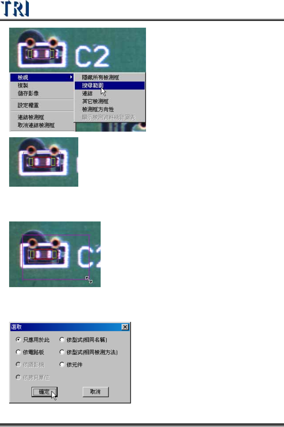 Test Research Inc. 414 TRI 7500 Series User Gu ide – Software Step2. 將萬用框調整至欲設定的搜尋範圍大小後,按下 [ 設範圍 ] 按鈕。 Step3. 選擇設定要套用的條件。