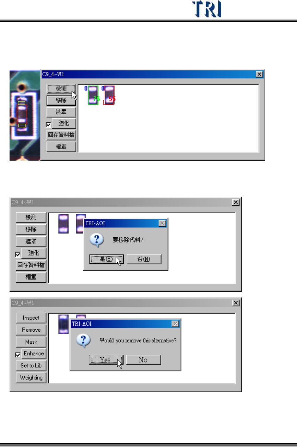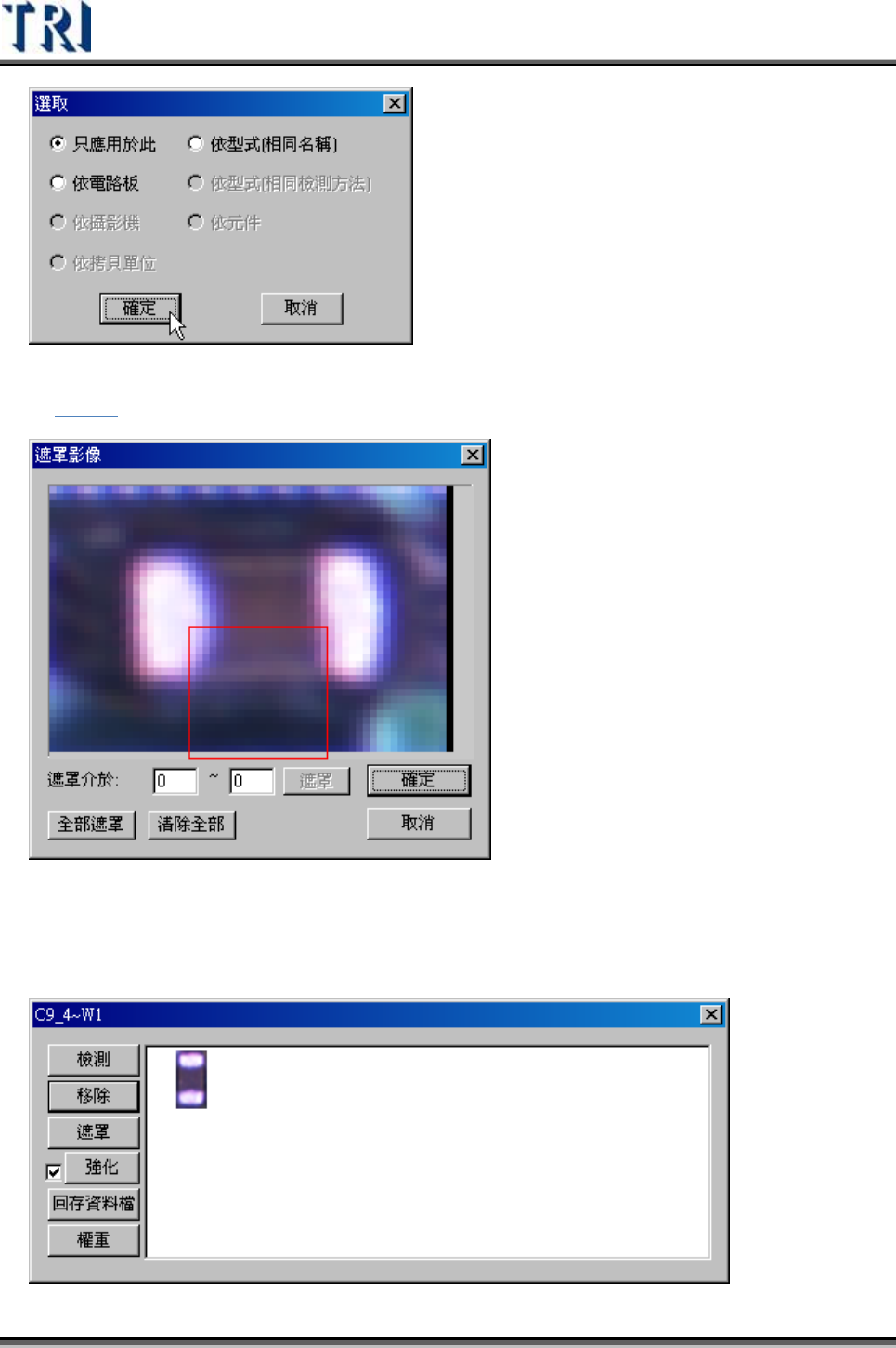 Test Research Inc. 420 TRI 7500 Series User Gu ide – Software 遮罩 (Mask) – 對於代 料 影像進 行 遮罩動作,對於遮罩功用與進 行 步驟請 參 考 4.9.8.2 。 強化 (Enhance) – 可以針對代 料 影像進 行亮度 和對比的加強,而取消前方打勾符號 可以將強化的設定解除。