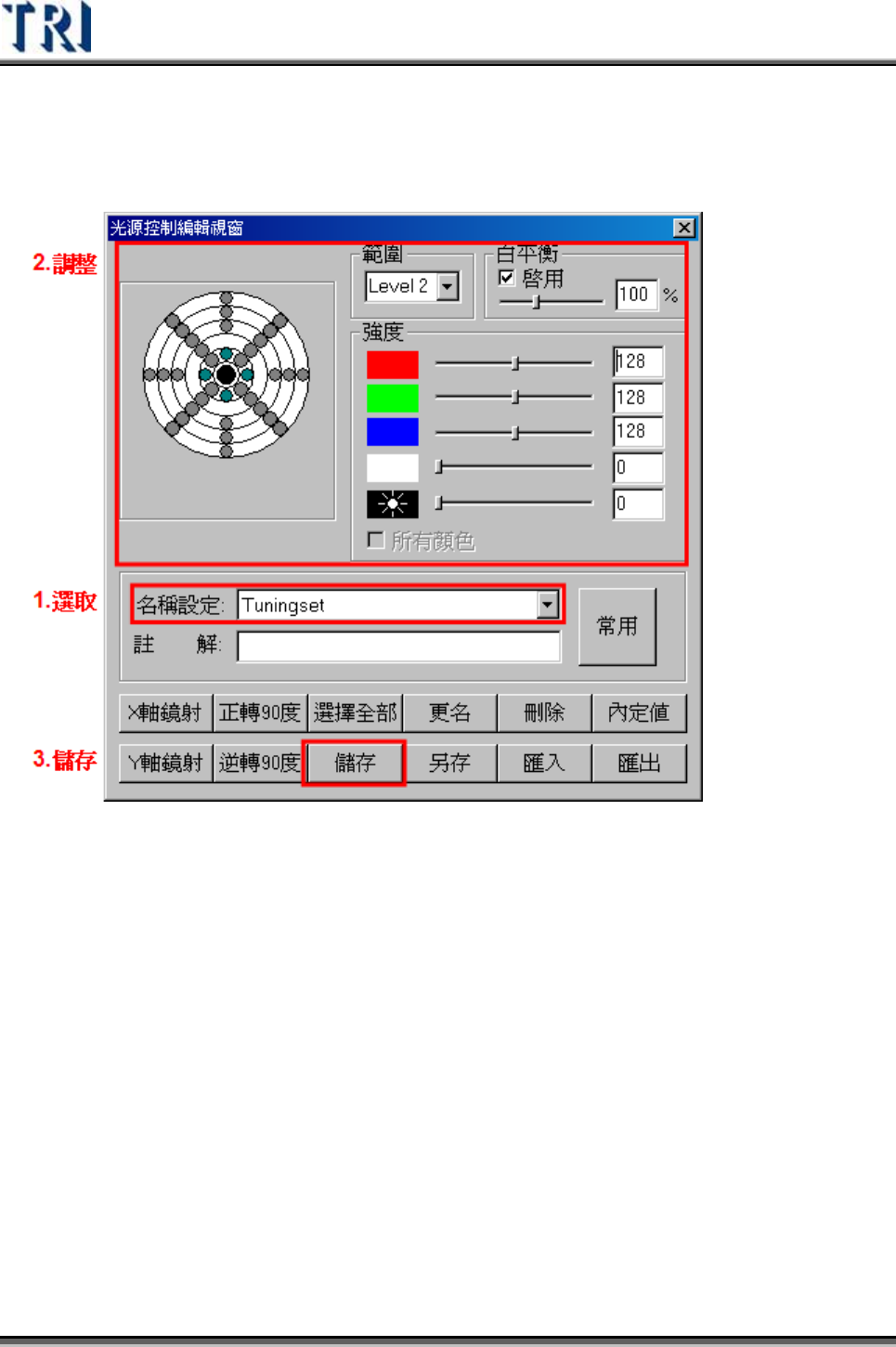 整,直到合適定位標記點後,按下[儲存]按鈕,燈光即設定完成。