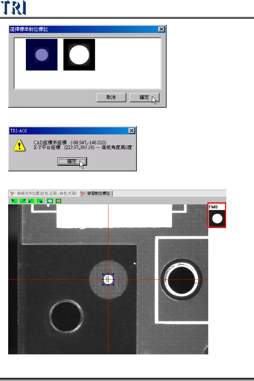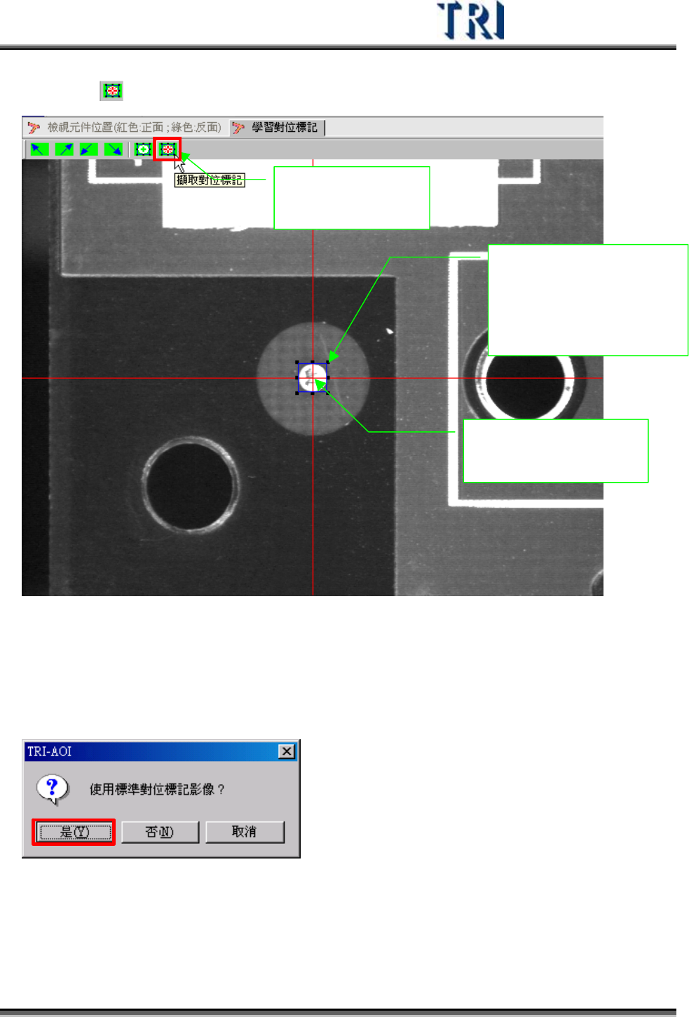 Test Research Inc. TRI 7500 Series User Gu ide – Software 33 4) 按下 [ 擷取對位標記 ] 按鈕 3. 按下此 按鈕擷 取對位標 記 1. 移動攝 影機至 標記 點的中心 位置 2. 調整 藍 色框的 大小至 與標記點 相同, 如此可 協助尋找 標記點 的中心 位置 5) 是否使用標準對位標記影像。 若 所能擷取到的對位標記影像 不 佳,則可選擇…