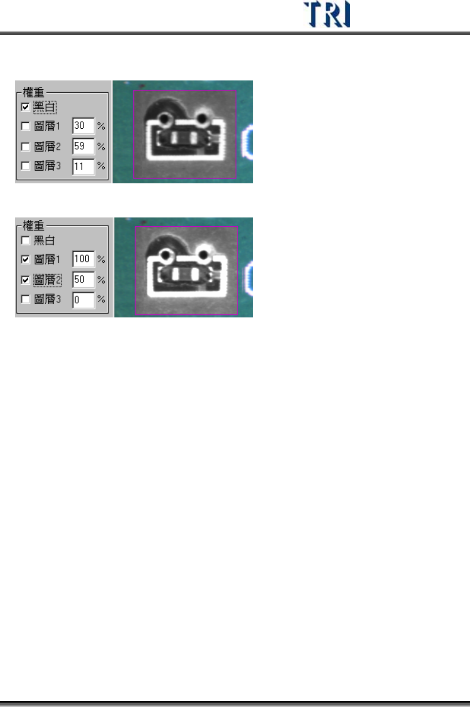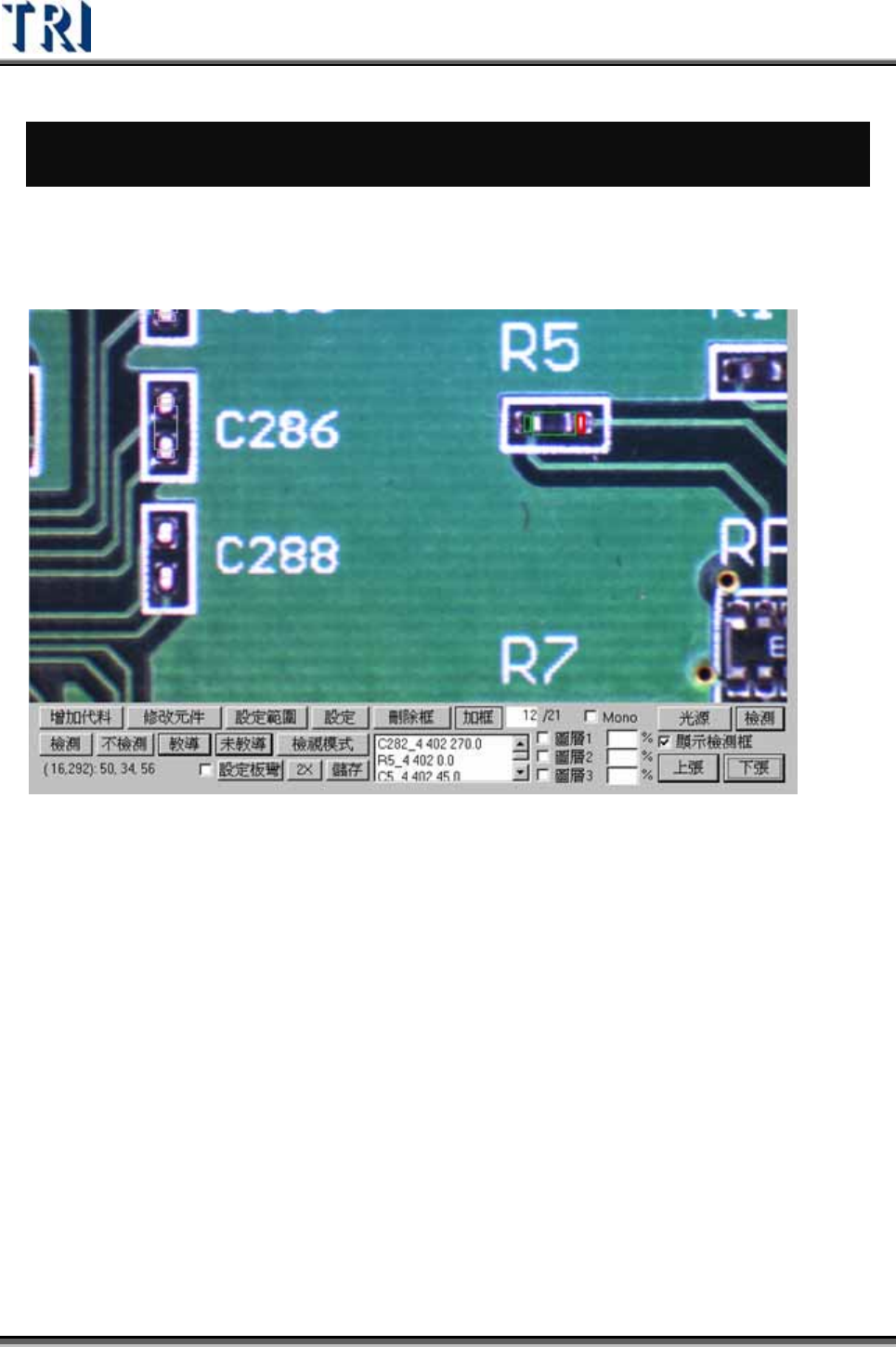 Test Research Inc. 450 TRI 7500 Series User Gu ide – Software 6 檢測結果視窗功能介紹 6.1 影像視窗功能 1) 1600x1200 螢幕畫面