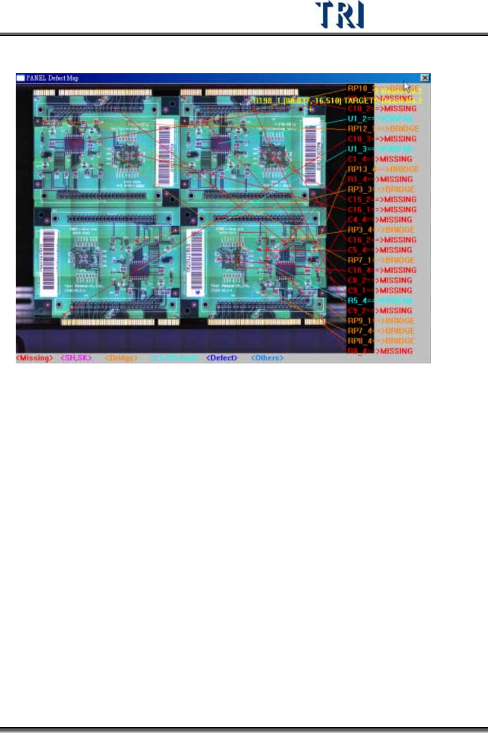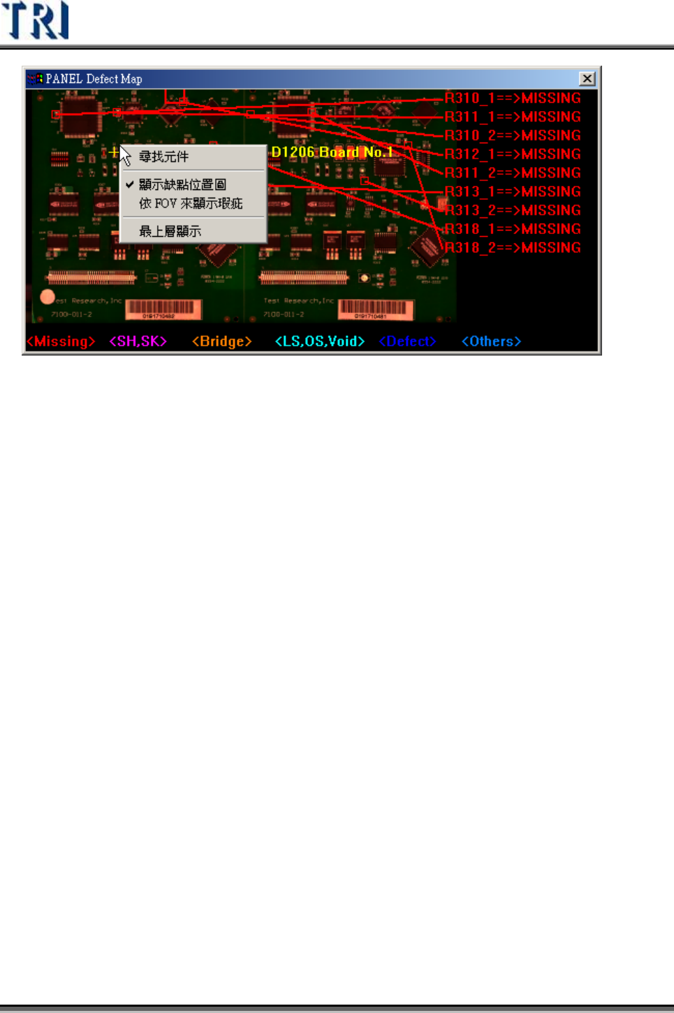 Test Research Inc. 454 TRI 7500 Series User Gu ide – Software 尋找元件 (Search Component) – 點選此按鈕,可指定在大圖上標示所選擇的特定元 件。 顯示缺點位置圖 (Show NG Map) – 勾選表示下次檢測時要出現本缺點位置圖, 不 勾 表示下次檢測開始 不 顯示。 依 FOV 來 顯示瑕疵 (Show defect…