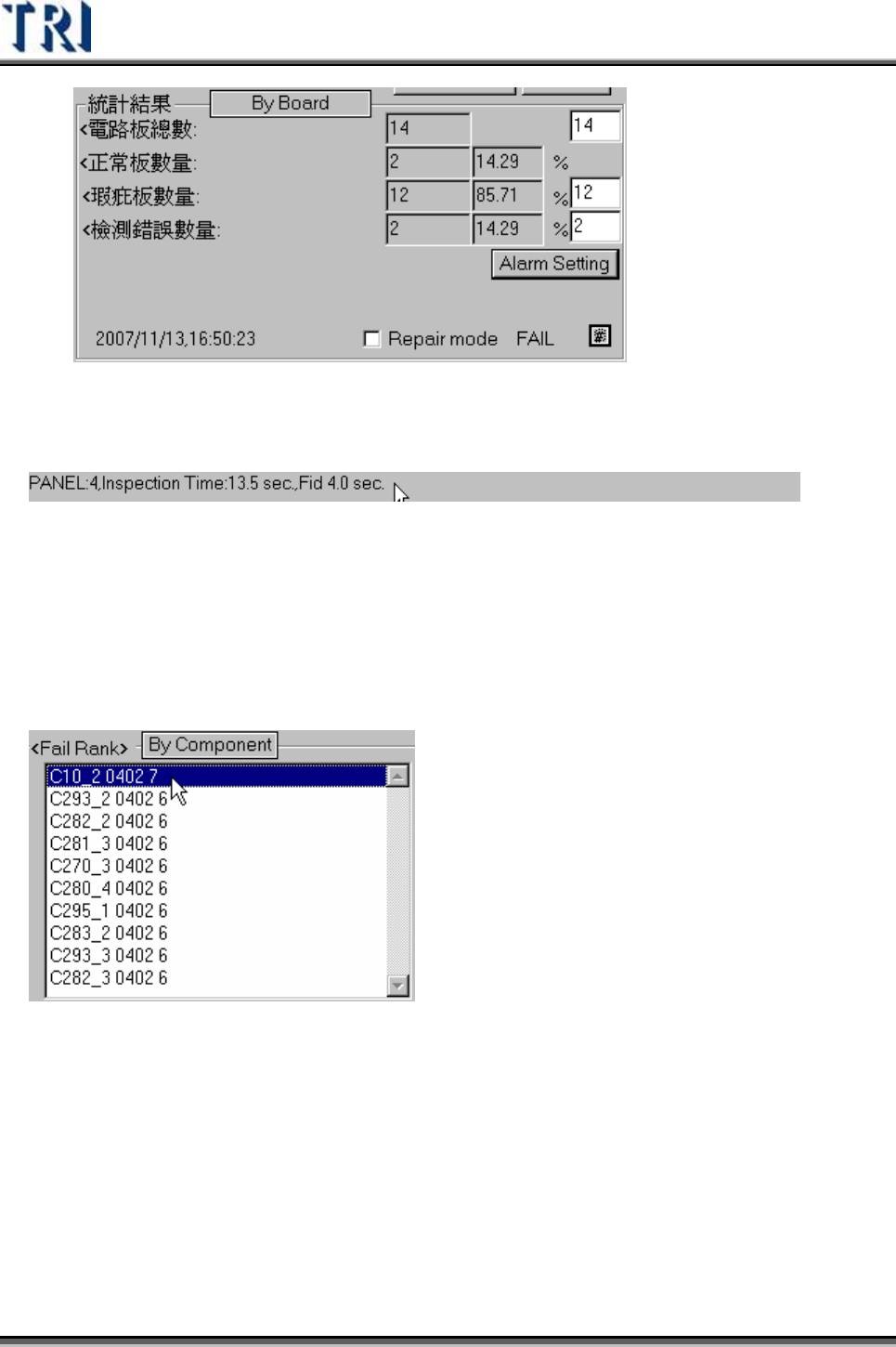Test Research Inc. 458 TRI 7500 Series User Gu ide – Software 檢測時間 欄 位 – 顯示檢測次 數 、總檢測時間及尋找定位點的時間。 瑕疵板統計 (Fail Statistic) – 列 出發生的瑕疵種 類 次 數 及百分比。 Fail Rank– 將元件發生瑕疵的排名 列 出 來 。可選擇依元件或依 類 型 列 出 不良 排序。 若 在登…