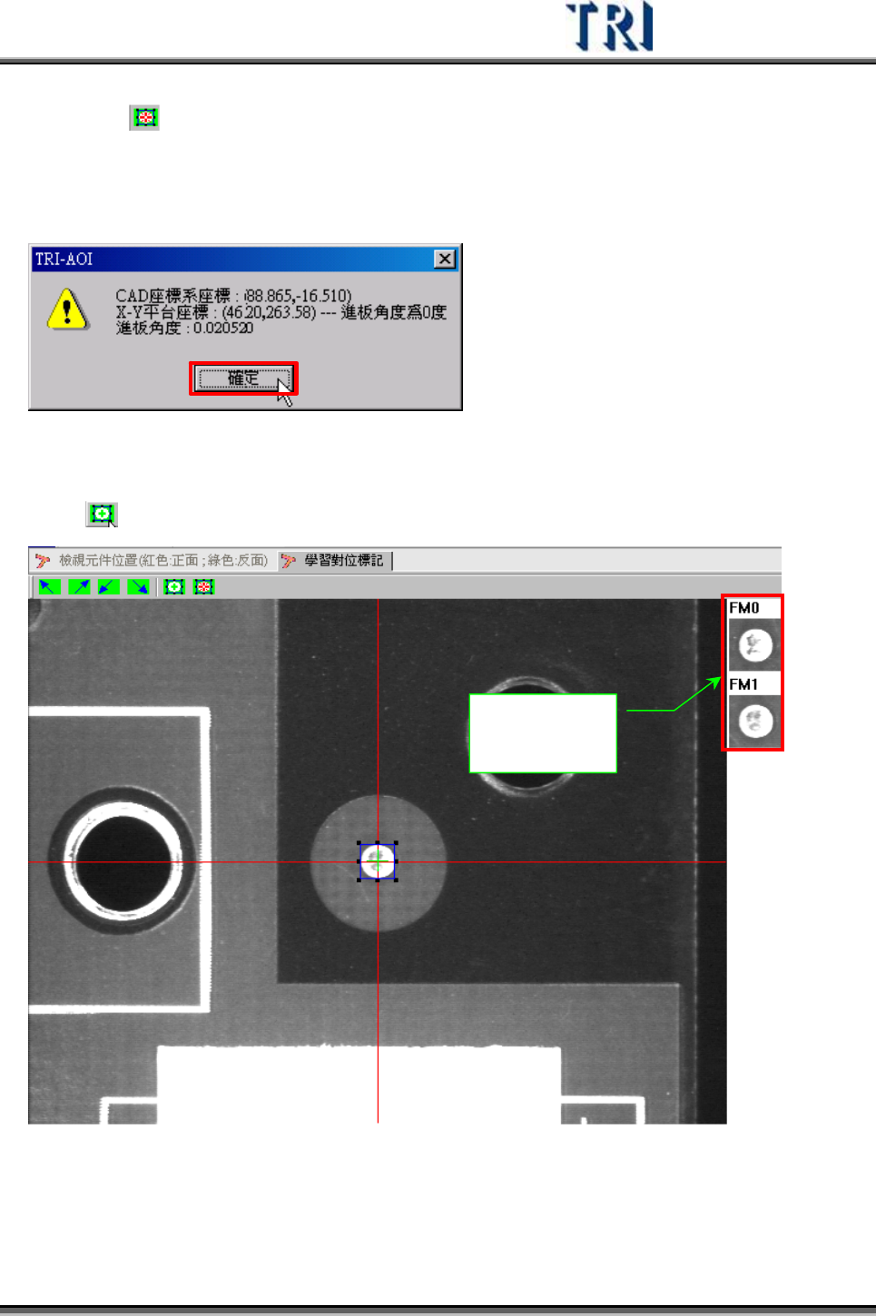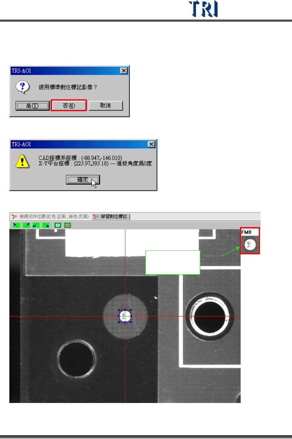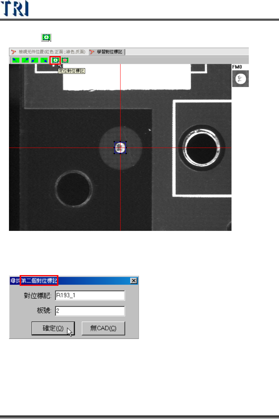 Test Research Inc. 36 TRI 7500 Series User Gu ide – Software 6) 按下 [ 定位對位標記 ] 按鈕,設定第二對位標記點 7) 輸入第二個對位標記點的名稱以及所在的板號,按 [ 確定 ] 。或按下 [ 無 CAD] 使用 手動尋找定位標記位置。 8) 設定第二對位標記點的燈光。 若 目前的燈光無法看清定位點的形 狀 ,可按下 [ 光 源設定按鈕 ] ,會…