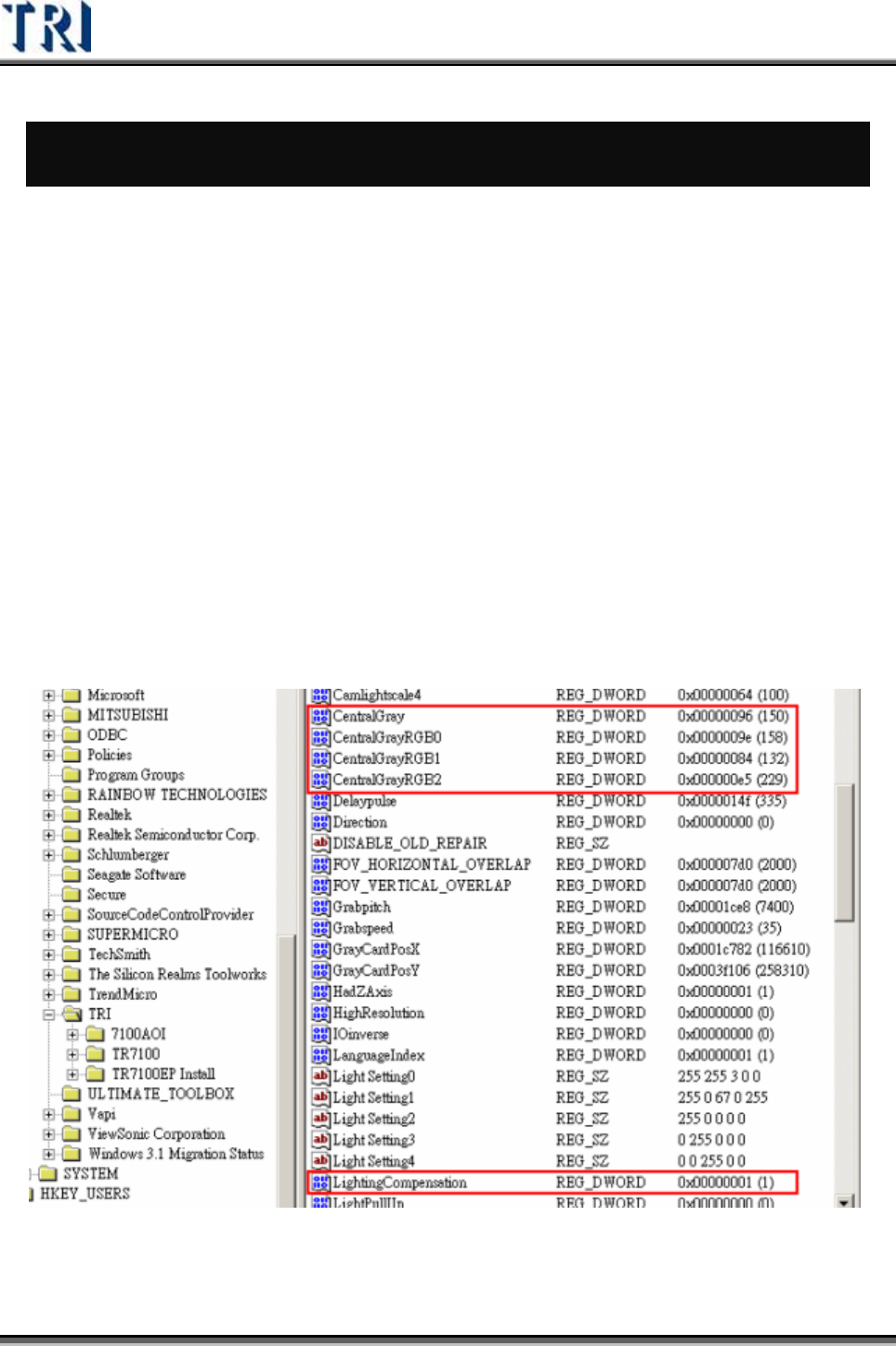 Test Research Inc. 490 TRI 7500 Series User Gu ide – Software 附 錄 一 燈光補償 1) 燈光補償功能 (Lighting Compensation) 此功能可對於攝影機以軟體進 行亮度 的補償。補償標準為當燈光設定為 60mA ,全區 亮度 128 時,灰卡影像的灰階值補償至 150 。 Step1. 按下 [ 開始 / 執 行 / 輸入 “rege…