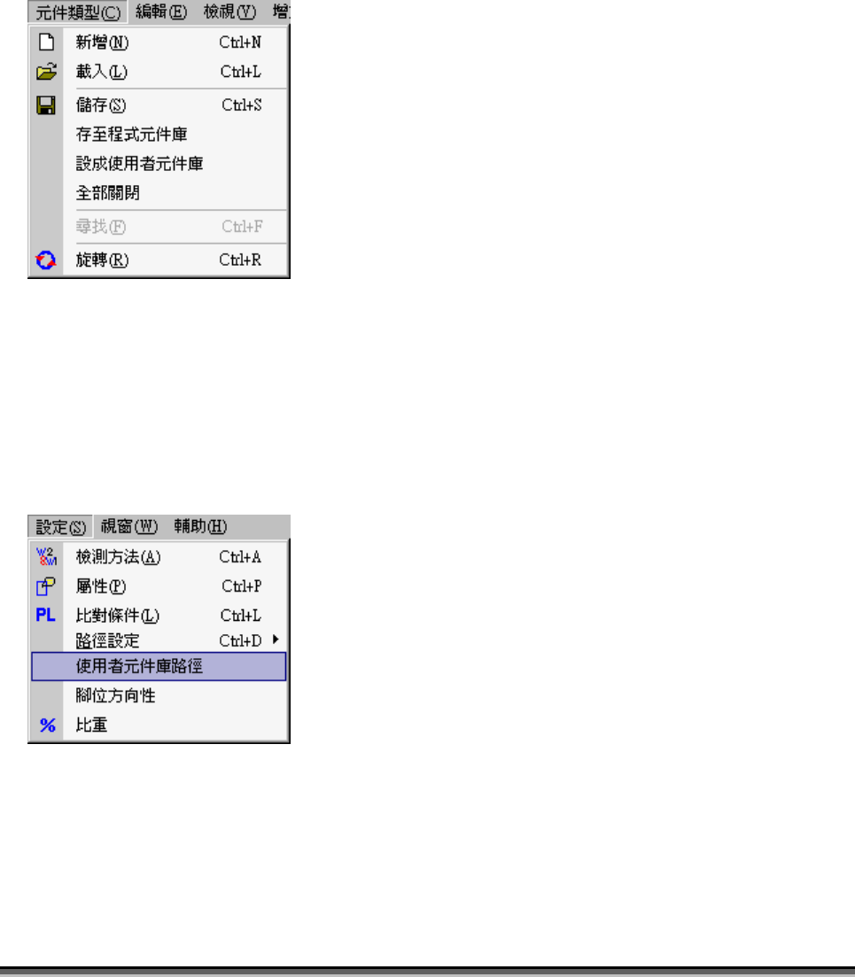 496 TR7600 User Guide – Software 編輯 Library 檔案時,系統會依據 [Project Library] 、 [User Library] 、 [System Library] 順序尋找是否有該 類 型的元件資 料 庫, 若 有則會自動載入, 若 無則須使用者 手動編輯。 若 載入的資 料 庫是從 [Project Library] 中載入的,則按存檔時,檔案儲存 的 路 徑是在…