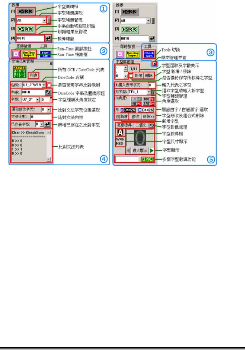 Test Research Inc. TRI 7500 Series User Gu ide – Software 509 1) 字 串 圍繞框 - 框選欲辨 識 的字 串 ,進入 Manual Train 時,系統將自動啟 動此功能,框選時請以「緊密圍繞」的方式框住字 串 ,以 利 字 串 自動 切 割及辨 識 。 2) 字型種 類 選取 - 利 用字型種 類 管 理 或字型下 拉 式功能表 來 指定字型種…