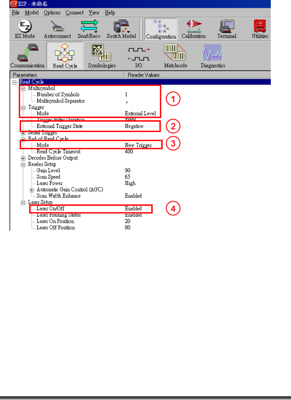 [Trigger Off]的訊號,才會停止讀取條碼,並將雷射光關閉。