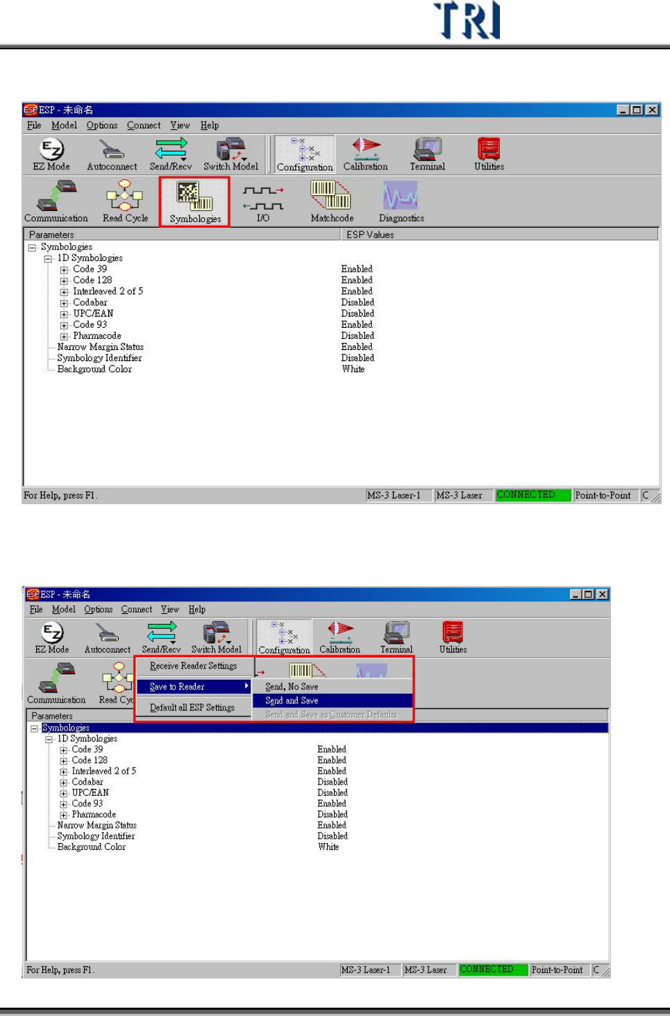 Test Research Inc. TRI 7500 Series User Gu ide – Software 525 C. 設定支援的條碼格式 (Symbologies) –設定條碼器支援的解碼格式。 8) 參數 確認完成後,需將 參數 傳給條碼器。