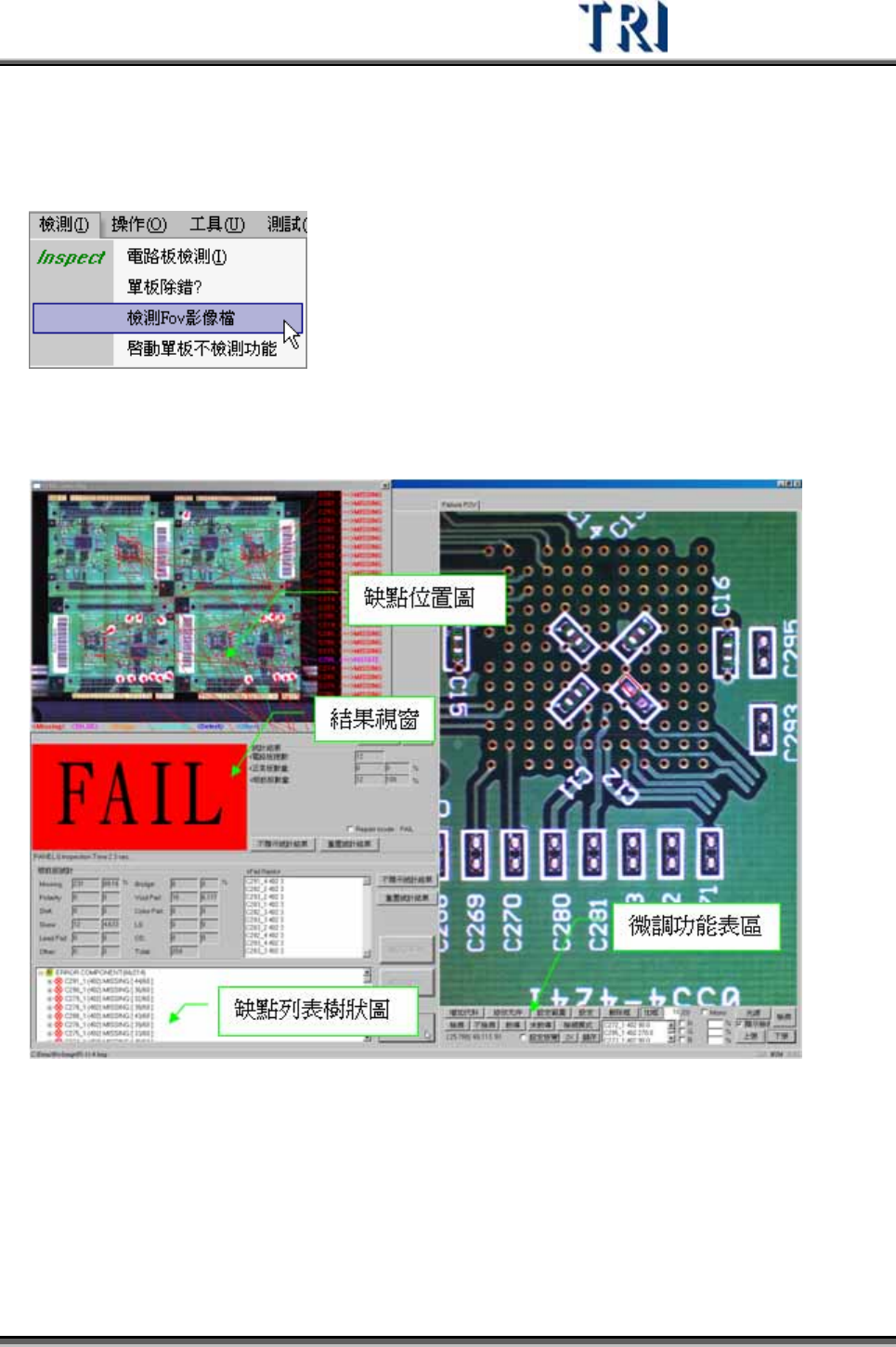 Test Research Inc. 52 TRI 7500 Series User Gu ide – Software 3) 可按 [ 下張 ] 按鈕,依序檢視 FOV 內檢測框的設定。亦可直接輸入號碼,將影像跳 至指定的缺點 FOV 。
