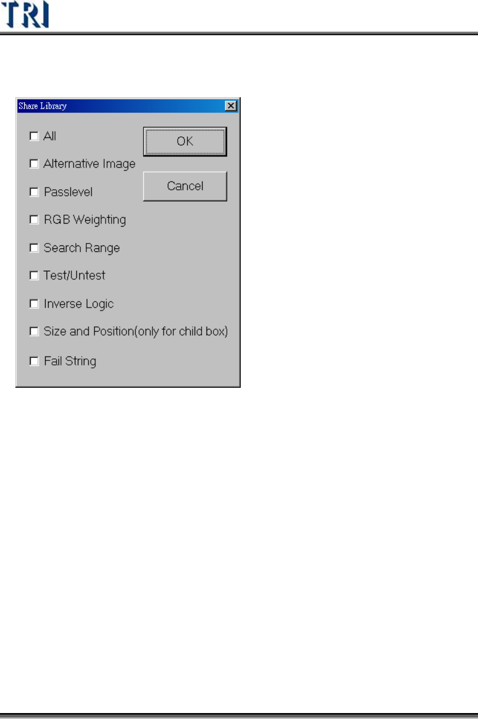Test Research Inc. 68 TRI 7500 Series User Gu ide – Software 3.3.2.6 設定共享元件資 料 庫項目 (Set Share Library Item) 啟動本功能時,代 料 影像可與所有 Project 共用。 1) Alternative Image 新增代 料 影像-當使用者在 Project 新增代 料 影像時,軟體會出現一個視窗,詢問 是…
