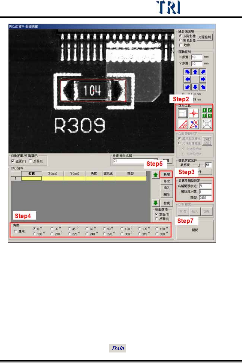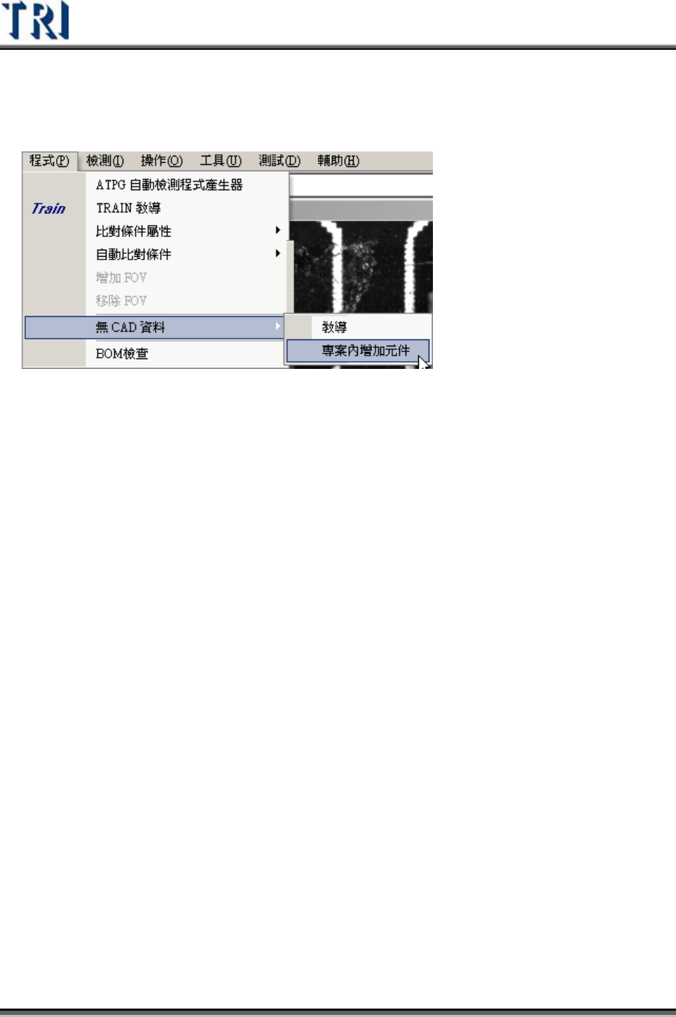 Test Research Inc. 144 TRI 7500 Series User Gu ide – Software 3.4.8.6 專案內增加元件 (Add Component in Pre.) 可使用本功能 來 增加新元件至一個已經存在的專案中 。 新增元件步驟 Step1. 按下 [ 程式 (Program)/ 無 CAD 資 料 (Non CAD)/ 專案內增加元件 (Add Component i…