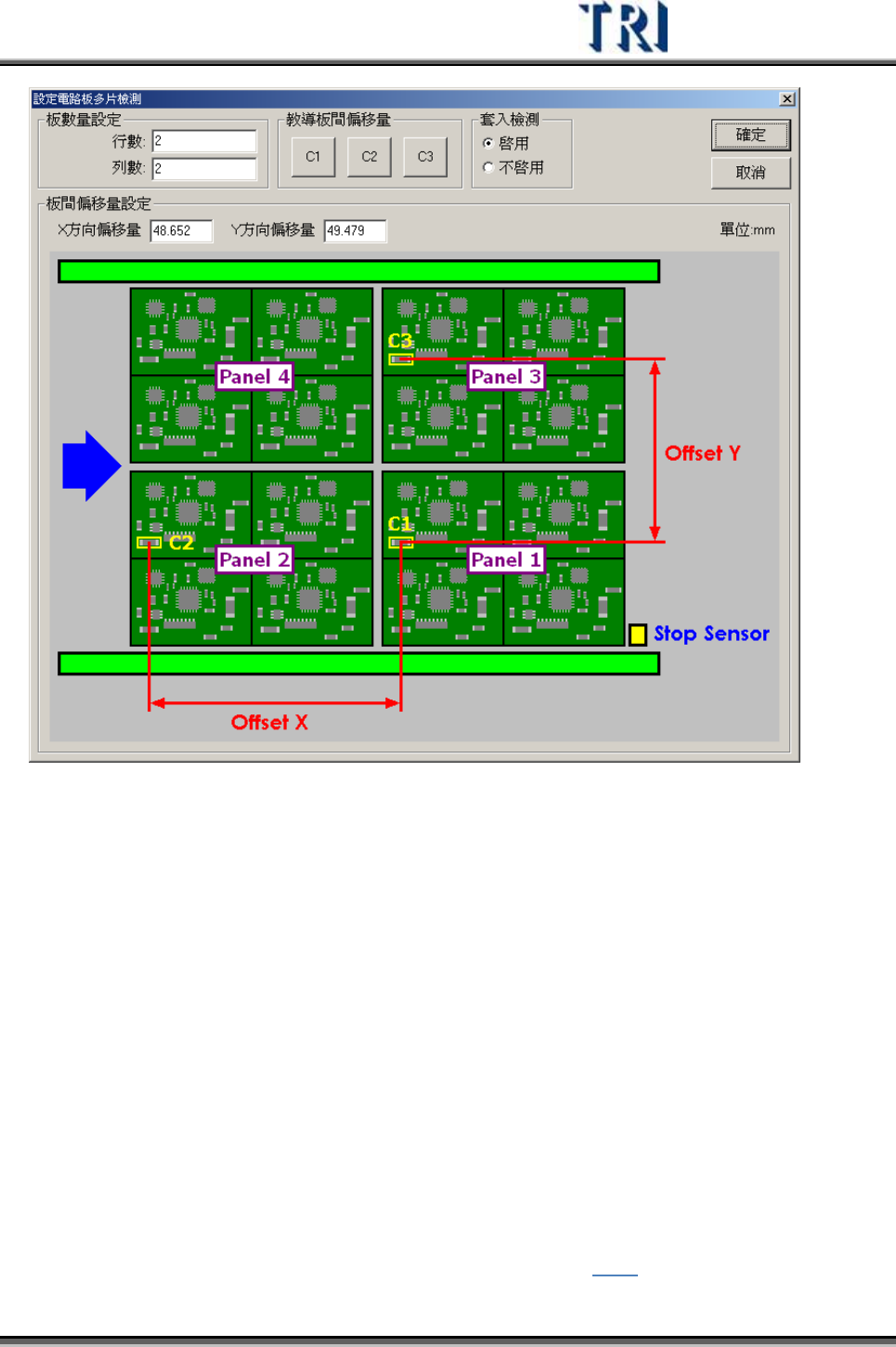 Test Research Inc. TRI 7500 Series User Gu ide – Software 155 z 行數 (Col(X)) – 設定本次檢測進板的 行數 。 z 列數 (Row(Y)) – 設定本次檢測進板的 列數 。 z 教導板間偏移 量 (Teach Panel Offset) – 本功能可協助教導圖示中的 [Offset X] 及 [Offset Y] 。其中 C1 、 C2…