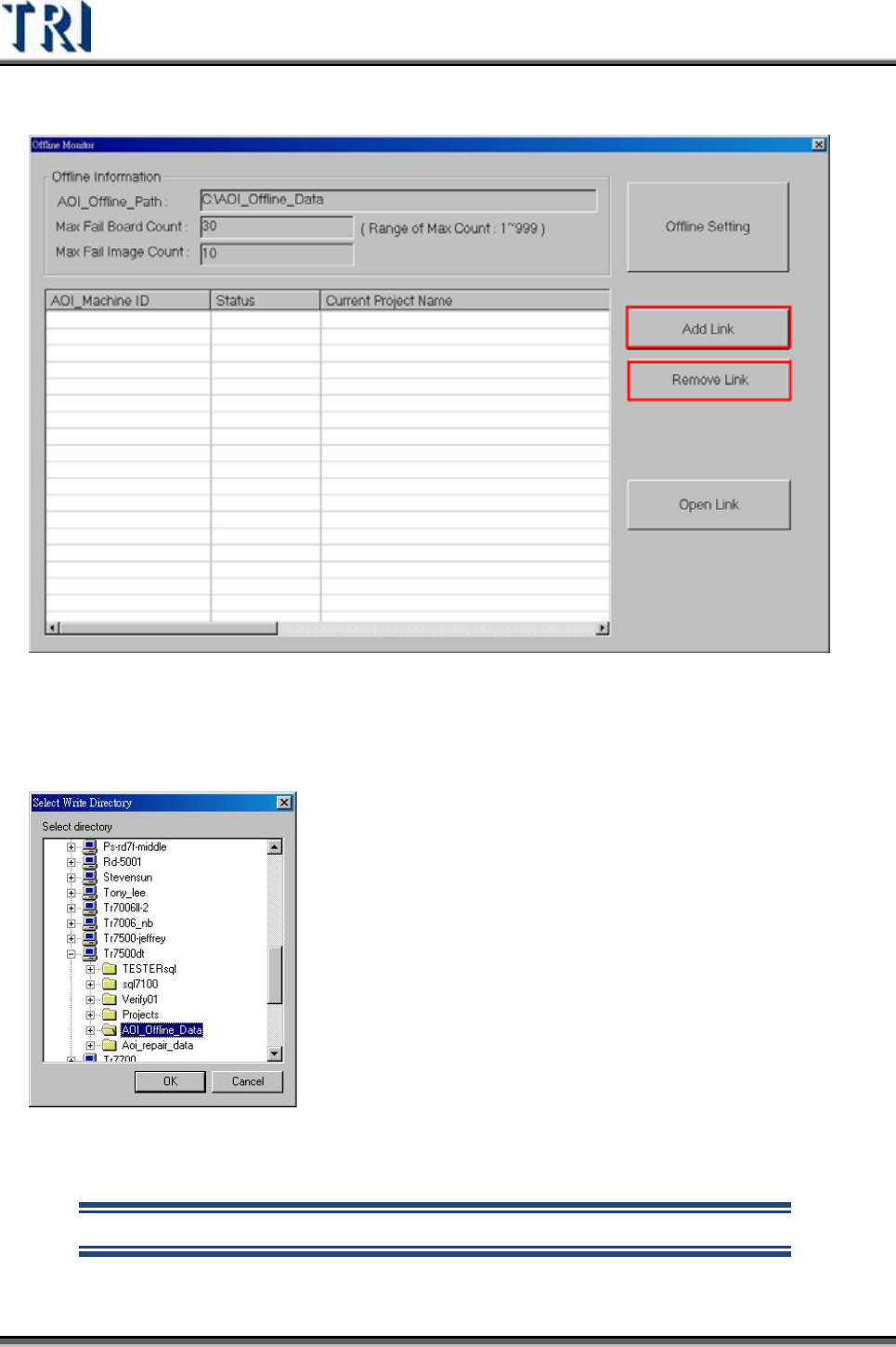 Test Research Inc. 218 TRI 7500 Series User Gu ide – Software 3) 使用者可以選擇加入一個 Inline 機台進 行 監控,或是刪除一個 Inline 機台。 4) 使用者選擇加入一個 Inline 機台進 行 監控,需要選擇 Inline 機台的一個資 料 夾, 並且設定權限讓 Offline Monitor 可以對該資 料 夾進 行讀 寫。 5) …