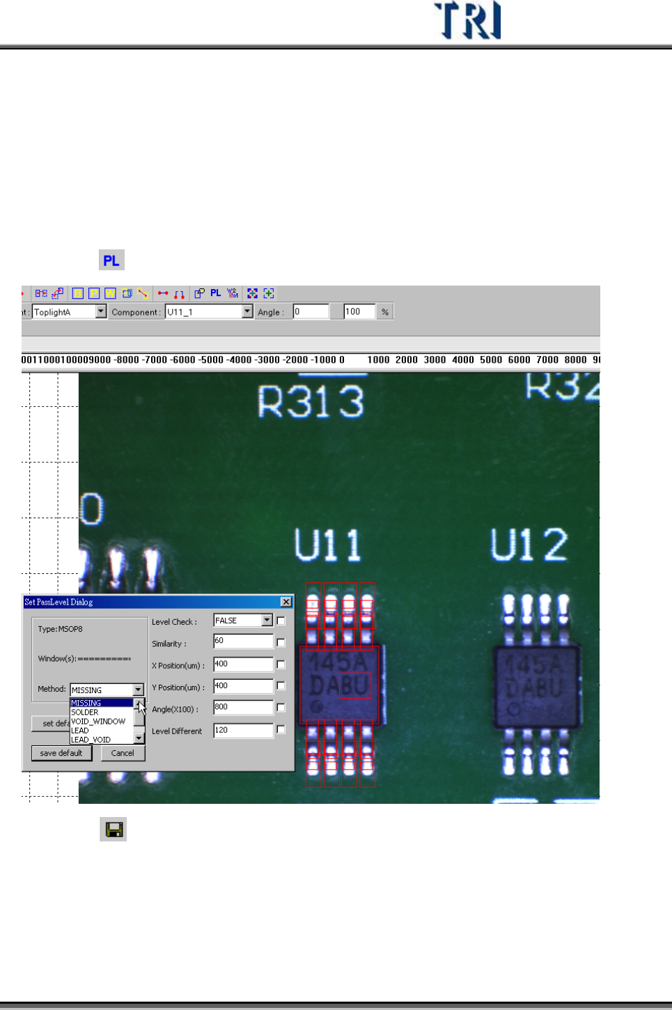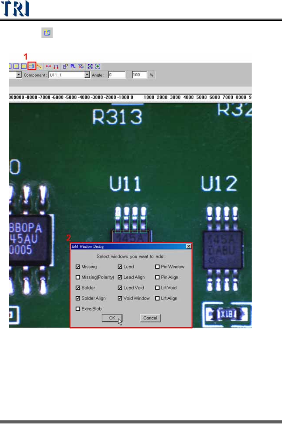 Test Research Inc. TRI 7500 Series User Gu ide – Software 353 6) 對於所有檢測框分別調整大小及設定 參數 7) 將檢測框以鏡射或旋轉複製方式複製到其他方向。選擇所有要複製的檢測框後按 下 [Mirror] 按鈕,並選擇鏡射方向後將檢測框複製完成。 8) 增加 [Lead] 以及 [Solder] 框的影像,只要設定其中一支腳系統會將影像套用到所有…