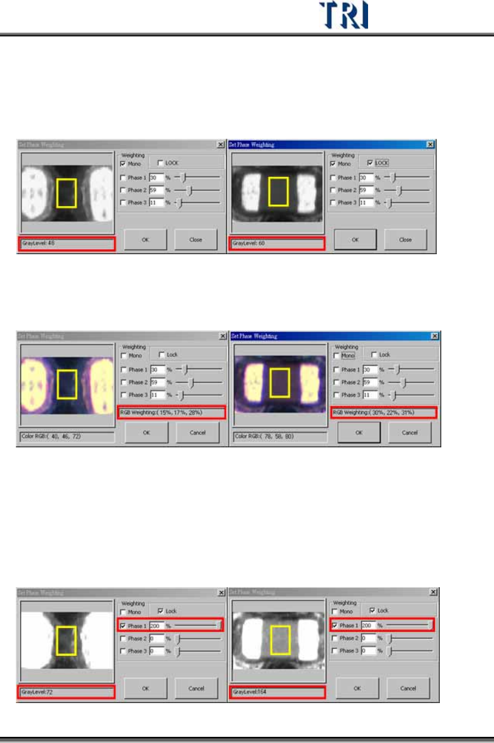 Test Research Inc. 378 TRI 7500 Series User Gu ide – Software 2) 在彩色影像時顯示顯示游標所指位置的 RGB 值,在黑白影像時顯示游標所指位 置的灰階值。 3) 設定 RGB Weighting 百分比權重,可直接輸入 數 值或以 滑 鼠在捲軸上左右 滑 動 調整大小。 4) 勾選 [ 鎖住 ] 表示保 留 本次權重的設定,作為下一次開啟本視窗的顯示…