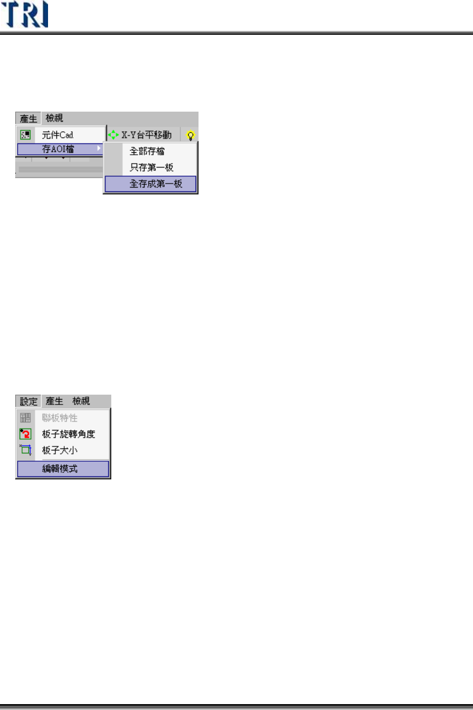 Test Research Inc. TRI 7500 Series User Gu ide – Software 383 Step5. 設定好新的多 連 板板 數 及角 度 配置後,依據一般程式製作 流 程重新製作以下 步驟。 1. 尋找進板旋轉角 度 (Rotate Angle) 2. 進 行 元件定位動作 (Locate) 3. 設定 1 號板大小 (Set Board 1 Size) 4. 重新製作定…