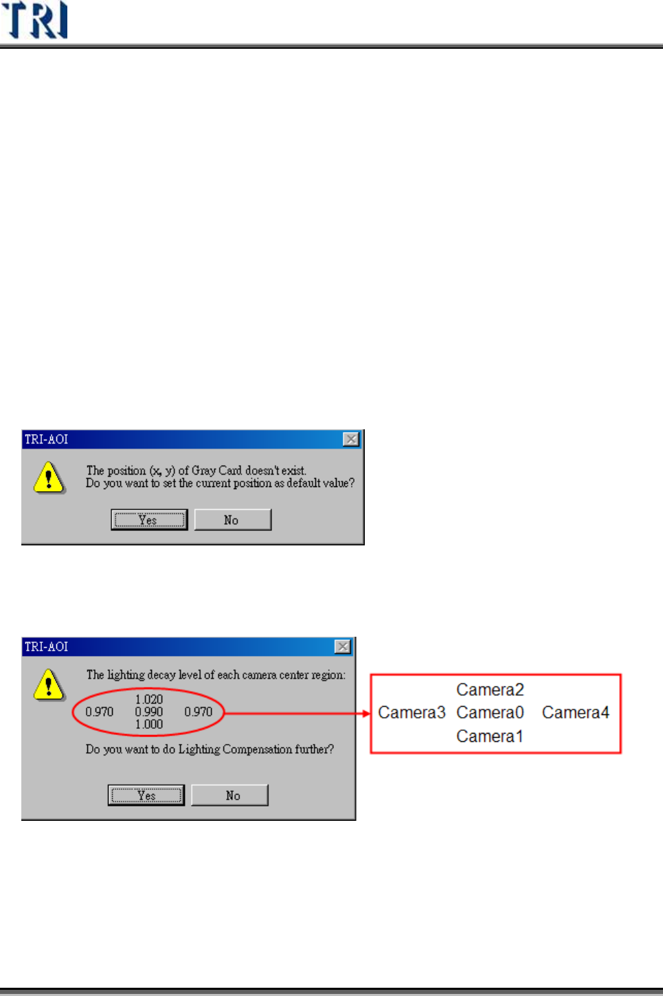 Test Research Inc. TRI 7500 Series User Gu ide – Software 493 Step6. 如果有任何一隻攝影機影像 亮度 衰減的程 度 大於 10% ,則在 Step5 中出現的 對話框會以以下的警告形式出現,提醒使用者衰減的情況過於嚴重,需要注 意。 Step7. 如果勾選 [ 自動檢查 (Auto Check)] ,表示每當開啟程式時,系統即會自動執 行 燈…