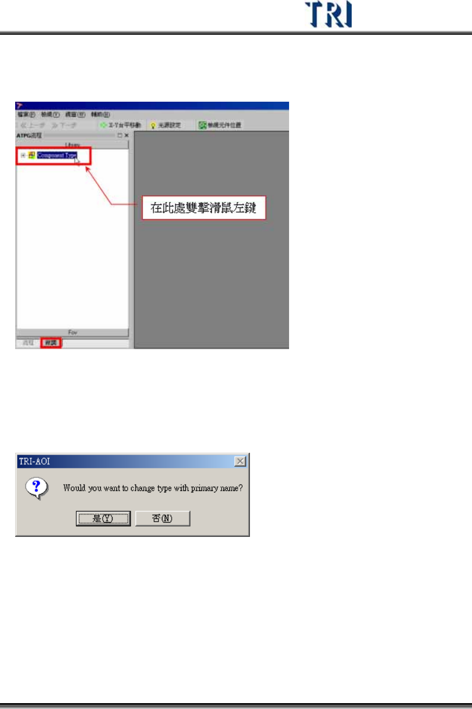 Test Research Inc. TRI 7500 Series User Gu ide – Software 39 1) 在 [ATPG 流 程 ] 欄 位之左下方,選擇 [ 微調 ] 頁籤,接著點選 [Library] 。在 [Component Type] 列 表上按 兩 下,此時攝影機會先尋找對位標記點,接著即 列 出 所有 類 型的元件 列 表。 2) 進入 ATPG/Library 會詢問是否…