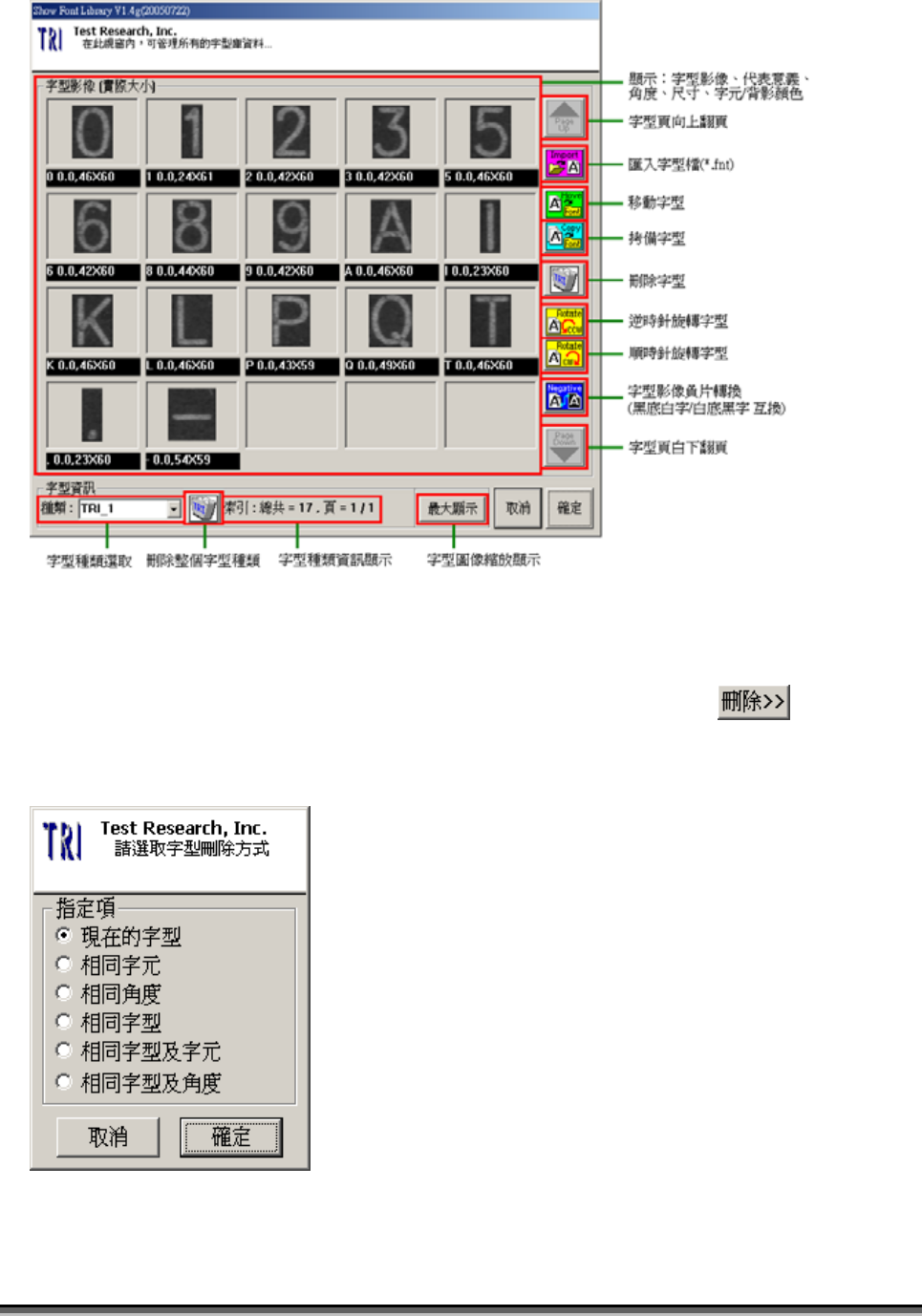時,可呼叫出如下圖的窗口,此窗口主要是以組合式條件來刪除字型之機制,內容包