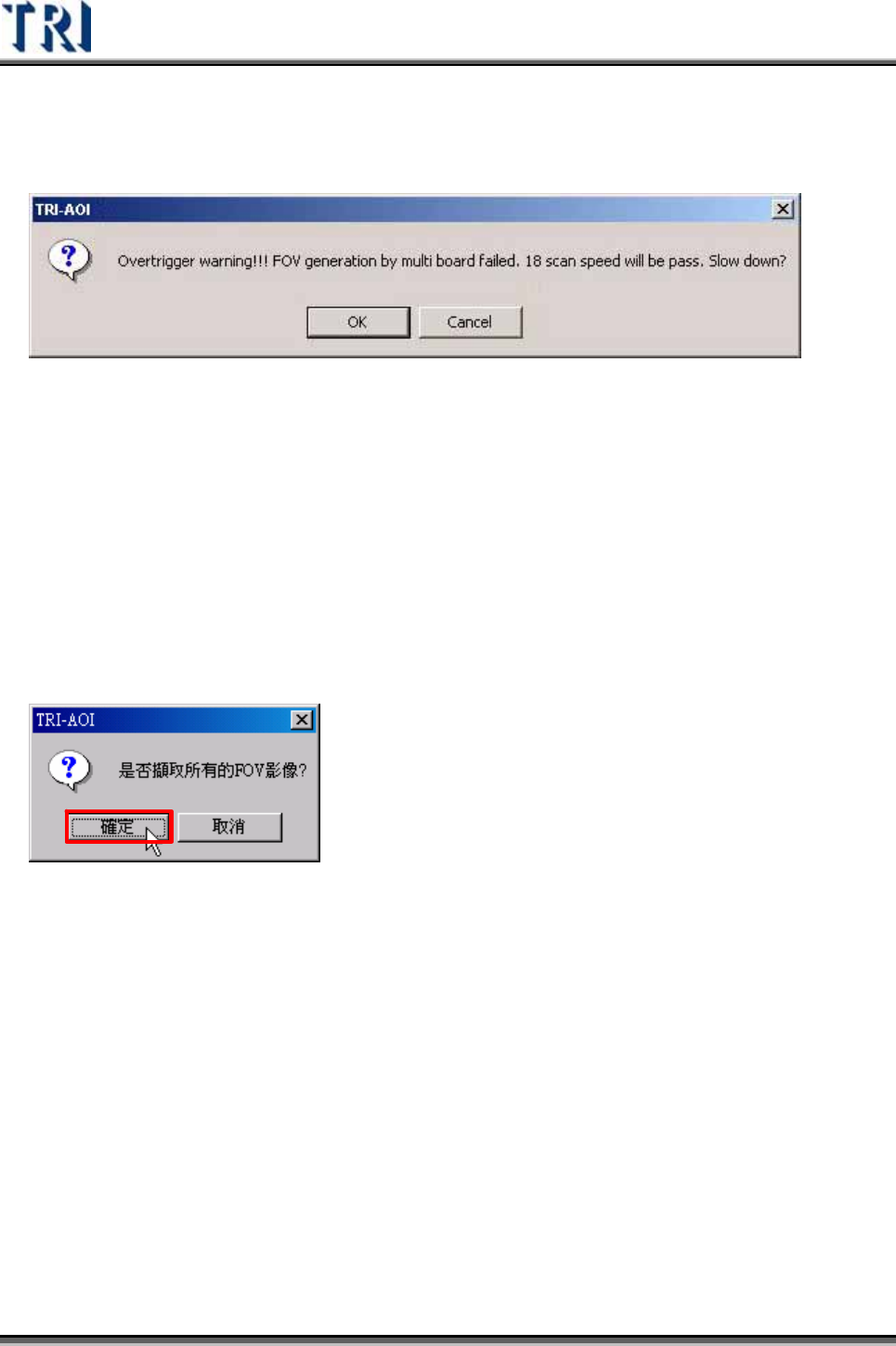 Test Research Inc. 44 TRI 7500 Series User Gu ide – Software 4) 若 多 連 板間的距 離 過密,且有元件距 離 板邊過近,會造成 FOV 過密的現象,系 統必須 降 速才能夠維持多 連 板 FOV 的配置,此時會出現如下視窗。遇到此視窗 時,可選擇以下三個方法繼續進 行 程式製作。 A. 選擇 [OK] 表示使用系統建議的速 度 進 行 掃描及檢測。…