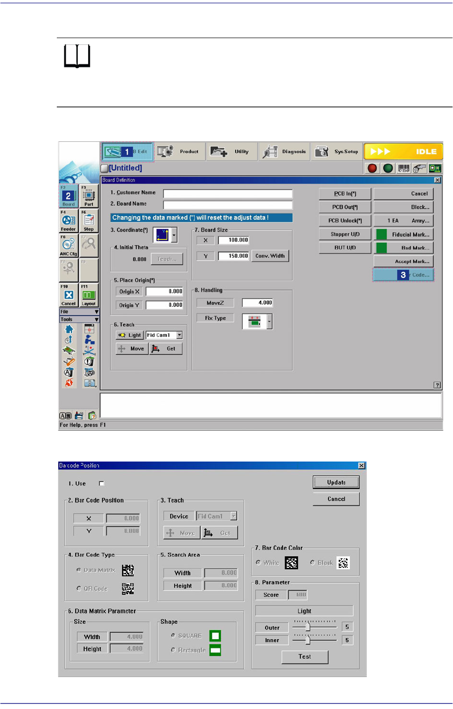 6-39 Board Definition 6.6.2. Barcode Position Reference In order to enable this function, the <Use 2D Barcode> ch e ck box must be selected from the ‘General’ tab dialog box in the ‘Preferences’ submenu of the ‘Sys…