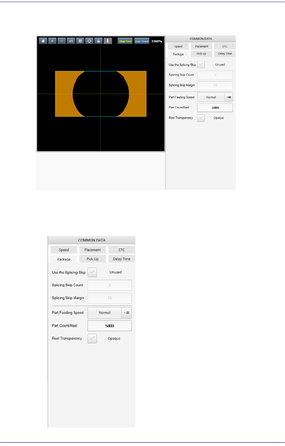 7-62 Fast Flexible Placer SM481(L) PLUS Administ r ator’s Guide 7.2.2.7. COMMON DATA Sets the handling parameters related to part pickup and placement. 1: Common Parameter <Package> tab Sets the parame t ers rela…