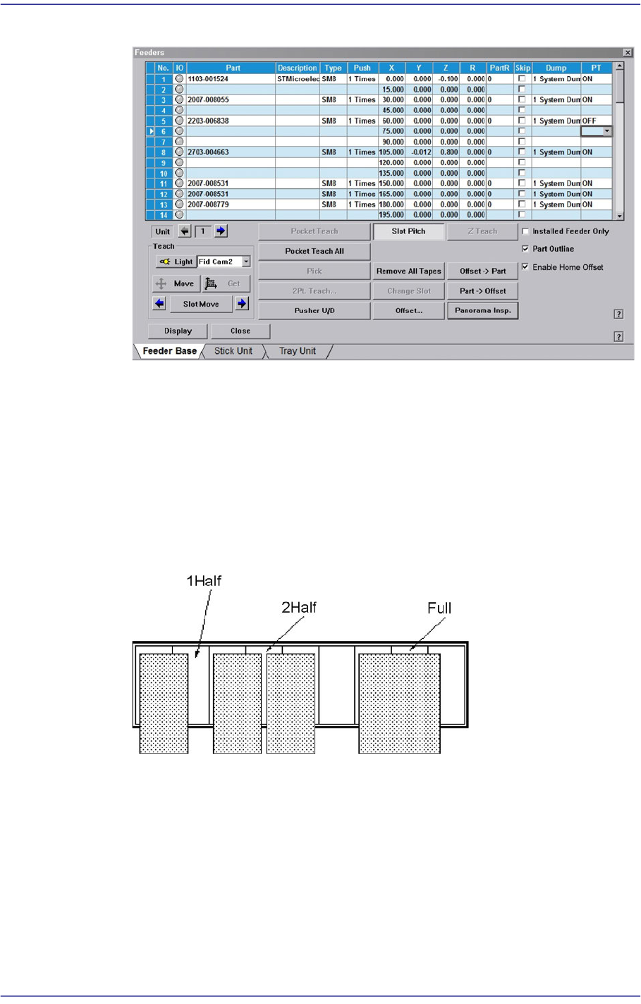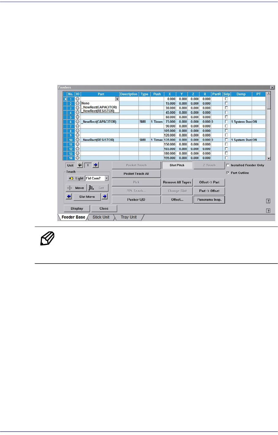 user can specify the part to be installed on each feeder, teach the pick-up position, and test