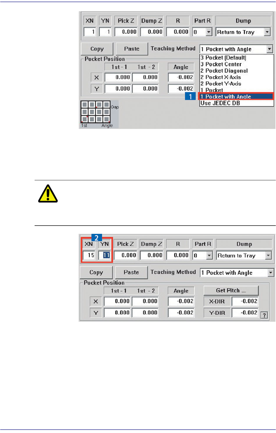 8-31 Feeder Setup (2)Enter the XN and YN values first to input the t otal number of pockets of the tray . XN: T otal number of poc kets in X dir ection YN: T otal number of poc kets in Y d ir ec tion Caution Be sure to i…