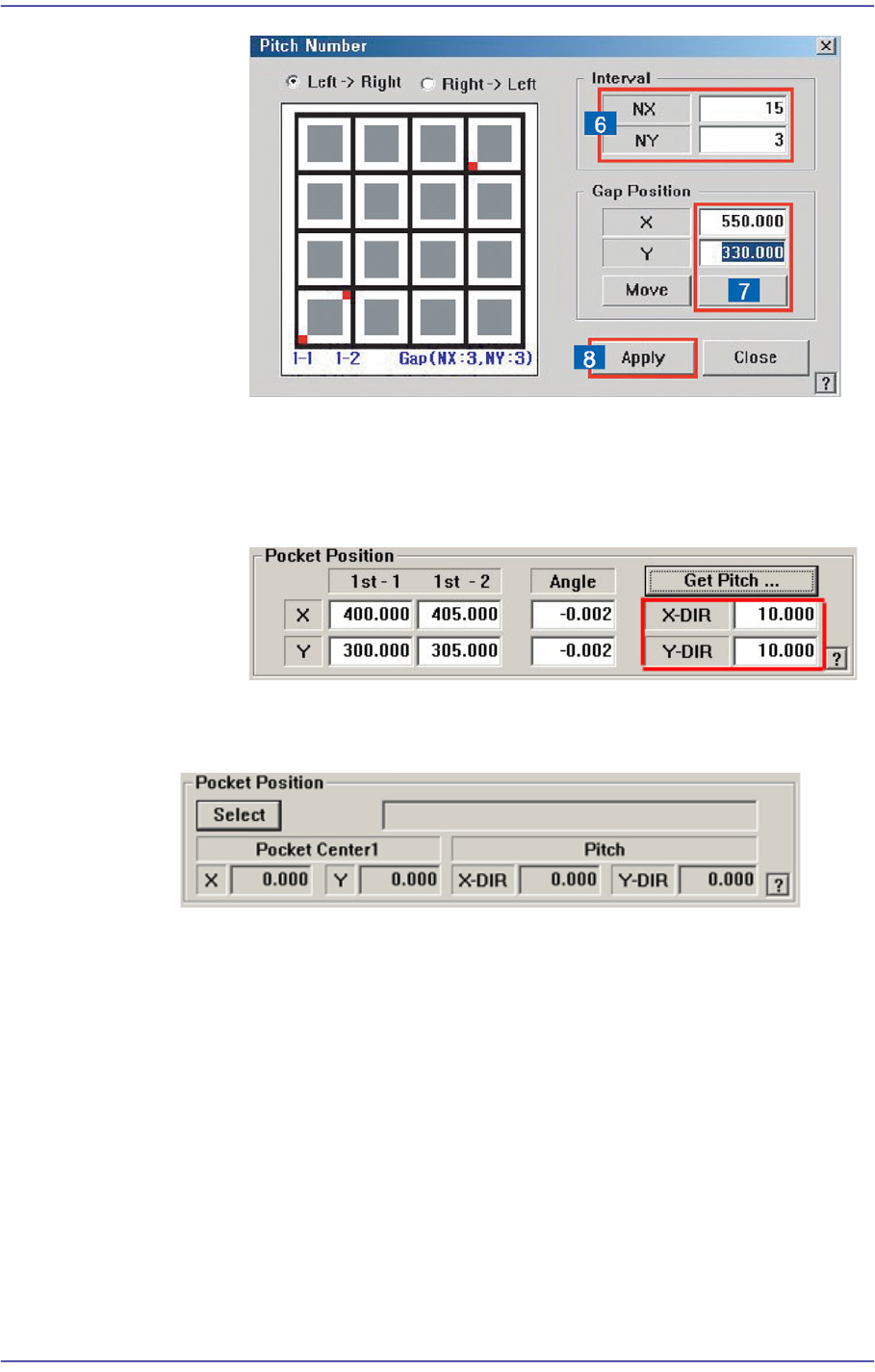 8-33 Feeder Setup (7)Input the pocket pos ition by clicking the <Get> button. (8)The final p i tch can be obtai ned as follows by clickin g the <App ly> button. However , the pitch can be directly entered ski…